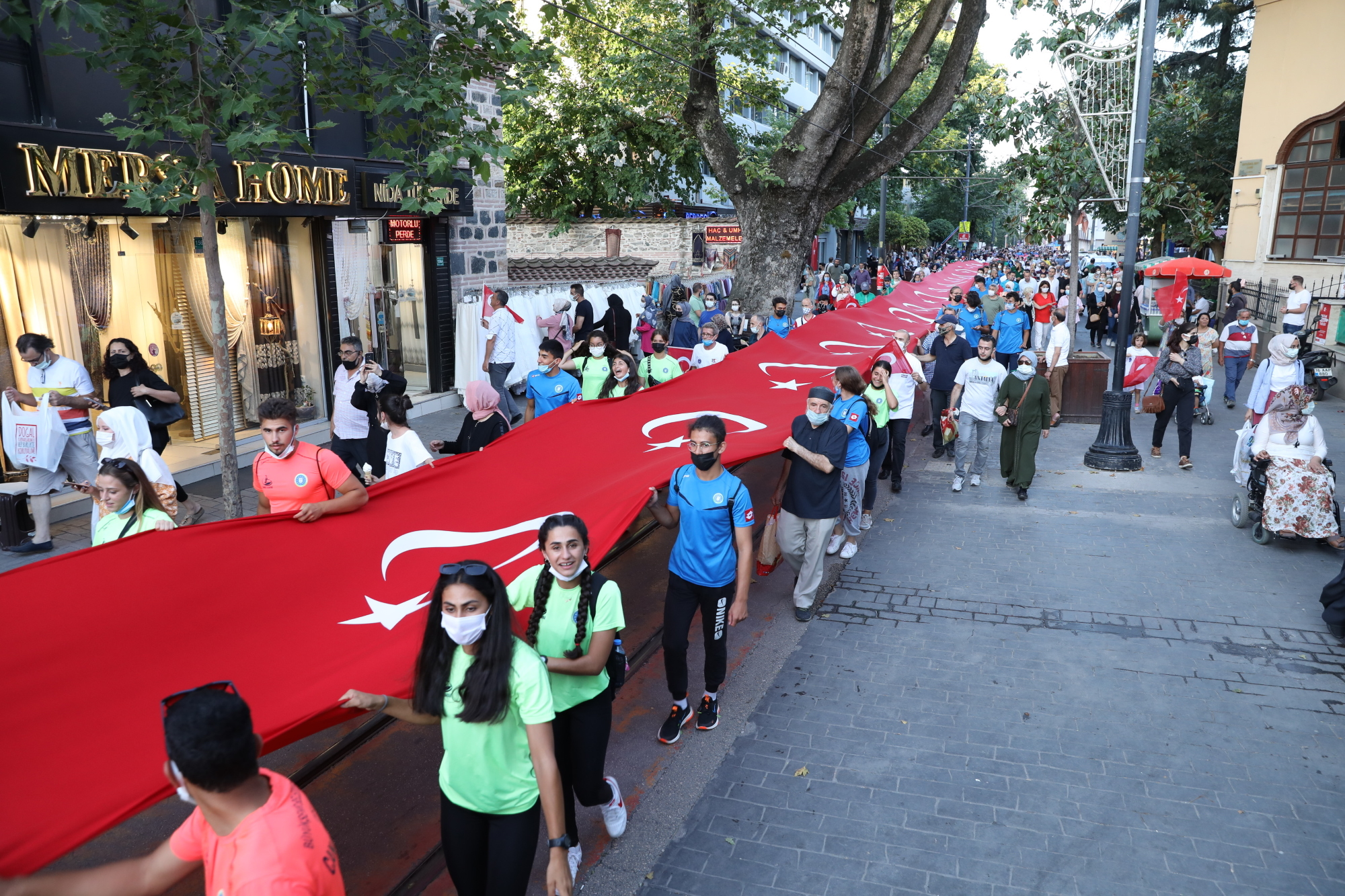 Bursa Valiliği’nin koordinasyonunda Bursa Büyükşehir Belediyesi tarafından düzenlenen 15 Temmuz Demokrasi ve Milli Birlik Günü etkinlikleri kapsamında bayrak yürüyüşü düzenlendi. Büyükşehir Belediye Başkanı Alinur Aktaş, AK Parti İl Başkanı Davut Gürkan, AK Parti MKYK üyesi Ayhan Salman ve BTSO Başkanı İbrahim Burkay’ın da katıldığı yürüyüşte, Bursalılar, Türk Bayrağı açarak Cumhuriyet Caddesi’nden Demokrasi Meydanı’na kadar yürüdü. Büyükşehir Belediye Bandosu’nun marşlarıyla coşku doruğa çıkarken, vatandaşlar da alkışlarıyla yürüyüşe destek verdi. Yürüyüşün ardından Demokrasi Meydanı’nda düzenlenen törene Bursa Valisi Yakup Canbolat, Bursa Milletvekili Refik Özen, Osmangazi Belediye Başkanı Mustafa Dündar, Devlet eski Bakanlarından Faruk Çelik, siyasi parti il temsilcileri ile çok sayıda vatandaş katıldı. Mehter Konseri ve Kuran tilavetiyle başlayan etkinlikte konuşan Bursa Büyükşehir Belediye Başkanı Alinur Aktaş, 15 Temmuz’un Türk milletinin diriliş destanı olduğunu vurguladı.
