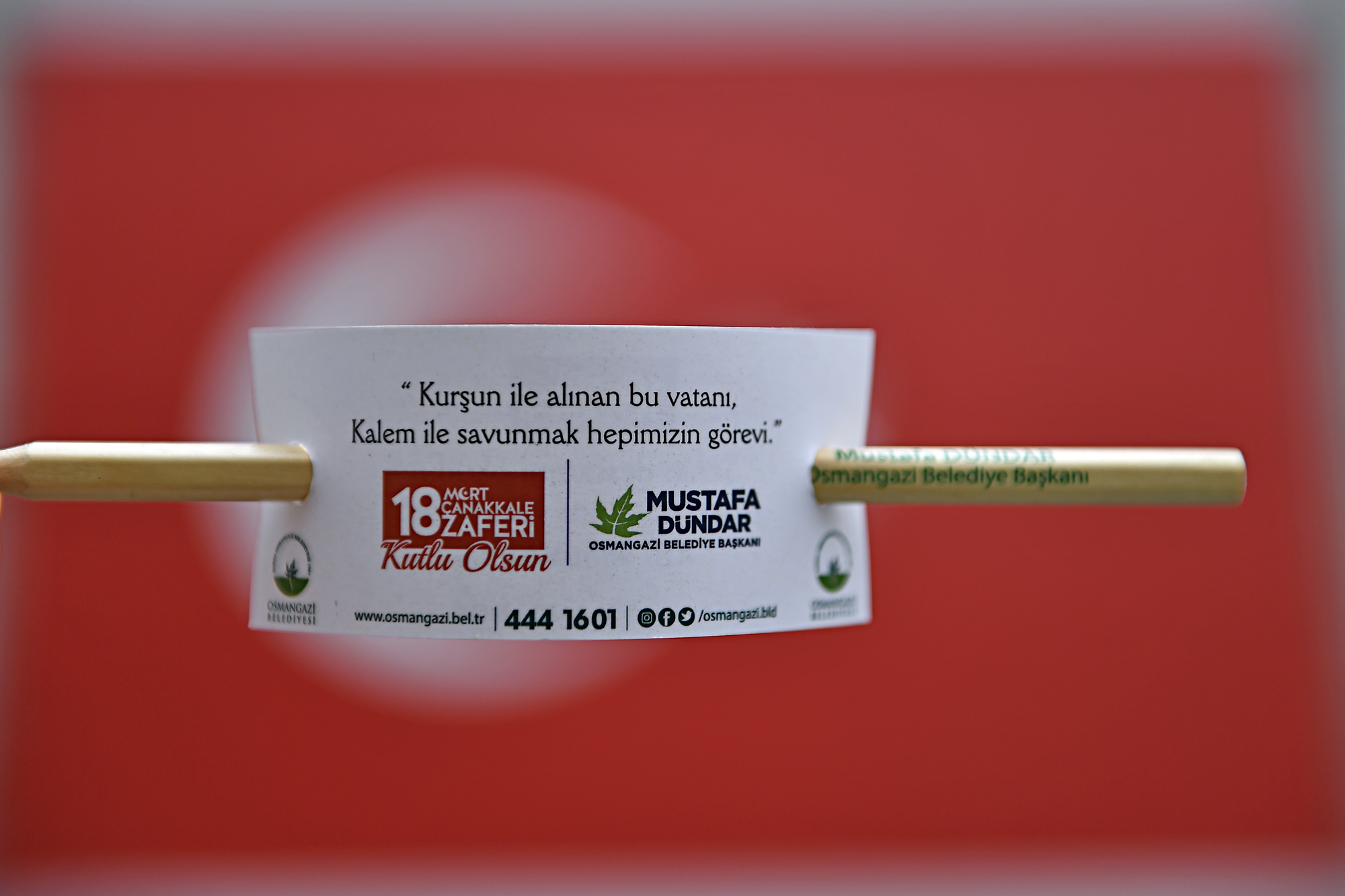Osmangazi Belediyesi, 18 Mart Çanakkale Zaferi’nin 107. yıl dönümünde kahraman şehit ve gazilerimizi anmak, şanlı destanı bir kez daha 7’den 70’e herkese hatırlatmak adına üzerinde, “Kurşun ile alınan bu vatanı, kalem ile savunmak hepimizin görevi” yazılı kalemler dağıttı.
