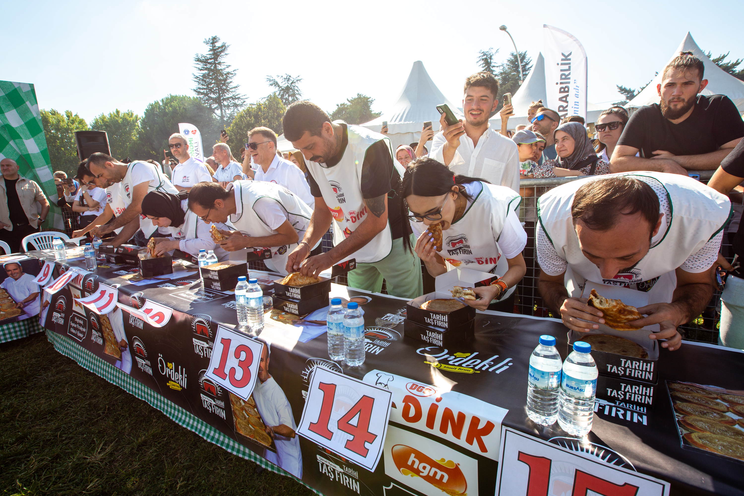 Bursa’nın gastronomi kültürünü ortaya çıkarmak amacıyla zengin bir içerikle hazırlanan 2. Bursa Gastronomi Festivali, ikinci gününde de birbirinden renkli etkinlik ve yarışmalara sahne oldu. Bursa’nın ünlü Tarihi Taş Fırını tarafından bu yıl da tahanlı pide yeme yarışması düzenlendi. Bursa’nın plakasının 16 olması nedeniyle 16 yarışmacının kabul edildiği müsabakada 16 dakikada en fazla tahanlı pideyi yiyen talihli arandı. Oldukça çekişmeli geçen yarışmada dakikalar ilerledikçe yarışmacılar lokmalarını yutmakta zorlanırken, bol bol su tükettiler. Bazı yarışmacıların enken pes ettiği yarışmada 8 adet tahanlı pideyi yiyerek birinci olan 22 yaşındaki üniversite öğrencisi Şevval Aylar, 10 adet çeyrek altının sahibi oldu. Yarışmayı 6,5 tahanlı yiyerek bitiren 33 yaşındaki Murat Aygit ikinci olarak 4 çeyrek altın, 4,75 tahanlı yiyerek üçüncü olan 37 yaşındaki Sabri Yıldızhan da 2 çeyrek altın kazandı.