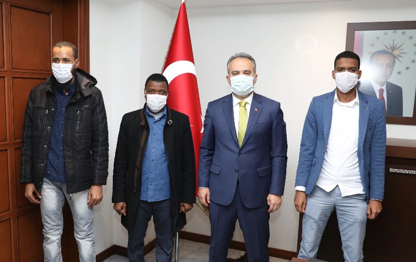 Bursa’da ilahiyat alanında doktora yapan Nijerli Muhammed Zakou Billou ve Ahmed Mahmud Cheikh ile İktisat alanında doktora yapan Zekeriya Edje Nouh, Bursa Büyükşehir Belediye Başkanı Alinur Aktaş’ı ziyaret etti. Eğitimleri süresince Büyükşehir Belediyesi’nin sağladığı destekler nedeniyle Başkan Aktaş’a teşekkür eden Afrikalı gençler, eğitimlerini tamamladıktan sonra ülkelerinin gelişmesi ve kalkınması için çalışacaklarını söyledi. Türkiye’nin Afrika’nın farklı ülkelerinde bir çok yatırımı olduğunu, bu yatırımların Türkiye’de eğitim alan öğrencilerle çok daha ileri noktalara taşınabileceğine dikkat çeken gençlerden Muhammed Zakou Billou, Başkan Aktaş’tan özellikle ülkesindeki altyapı yatırımları için destek istedi. Bursa’da rutin bir iş olarak düzenli olarak yapılan kanalizasyon ve içme suyu hatları gibi hizmetlerin, ülkelerinde bir türlü başarılamadığını ifade eden Billou, “Sizin bu konudaki tecrübelerini ülkemize yansıtmak isteriz. Kardeş şehir ilişkisi veya farklı yöntemlerle sizin bilgi birikiminizi kullanabilmek bile bizim için büyük önem taşıyor” dedi.