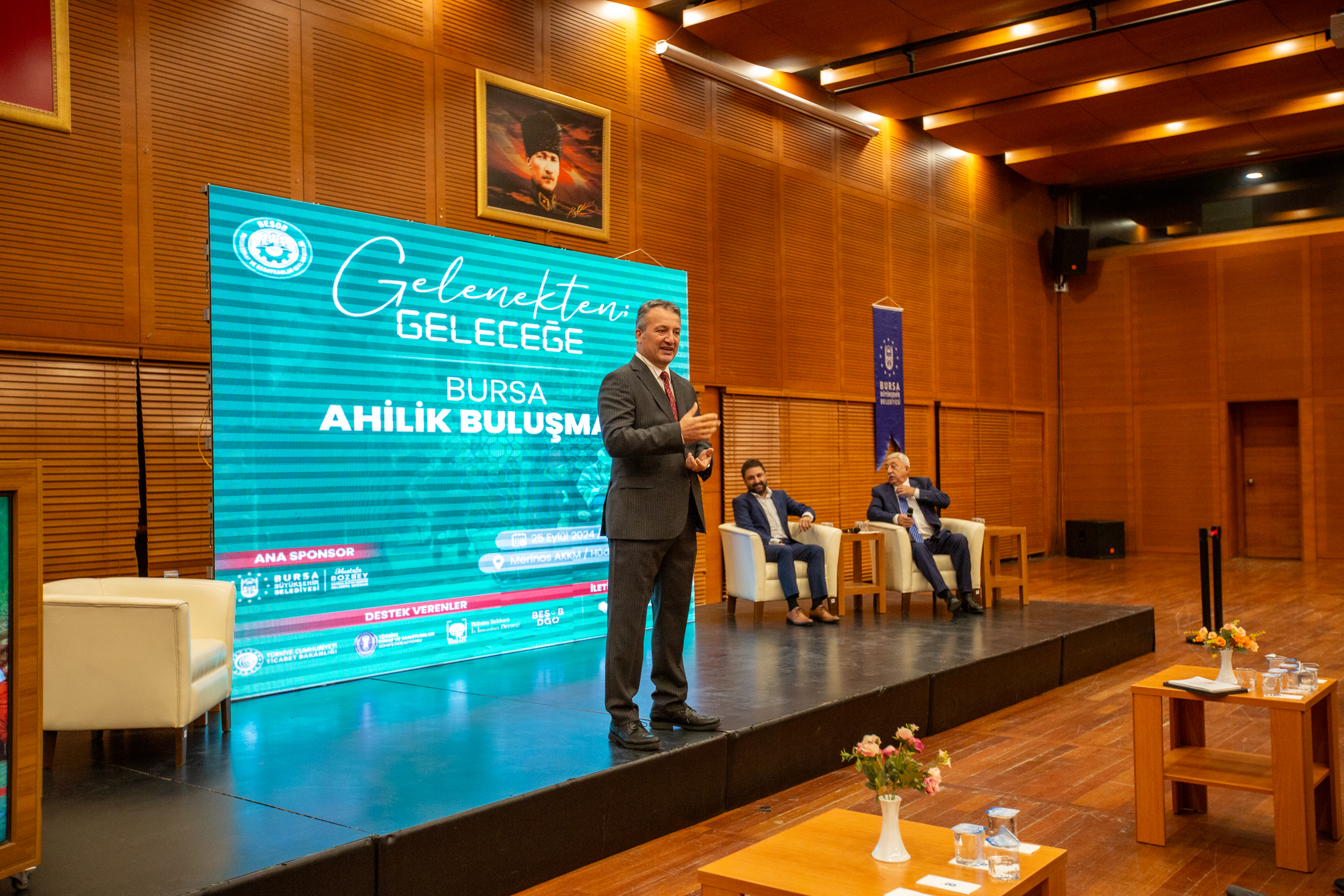 Bursa büyükşehir Belediyesi’nin destekleriyle BESOB tarafından düzenlenen ‘Gelenekten Geleceğe Bursa Ahilik Buluşması’ ise Merinos Atatürk Kongre ve Kültür Merkezi’nde yapıldı. Programa, Bursa Büyükşehir Belediyesi Başkanvekili Mehmet Aydın Saldız’ın yanı sıra Türkiye Esnaf ve Sanatkârları Konfederasyonu (TESK) Genel Başkanı Bendevi Palandöken, BESOB Başkanı Fahrettin Bilgit, BİSİAD Yönetim Kurulu Başkanı İdris Doğrul, Türkiye Esnaf ve Sanatkarlar Kredi ve Kefalet Kooperatifleri Birliği (TESKOMB) Genel Başkanvekili Bahri Şarlı, Esnaf Sanatkarlar ve Kooperatifçilik Genel Müdürü Taha Enes Şener, oda başkanları ve çok sayıda esnaf katıldı.