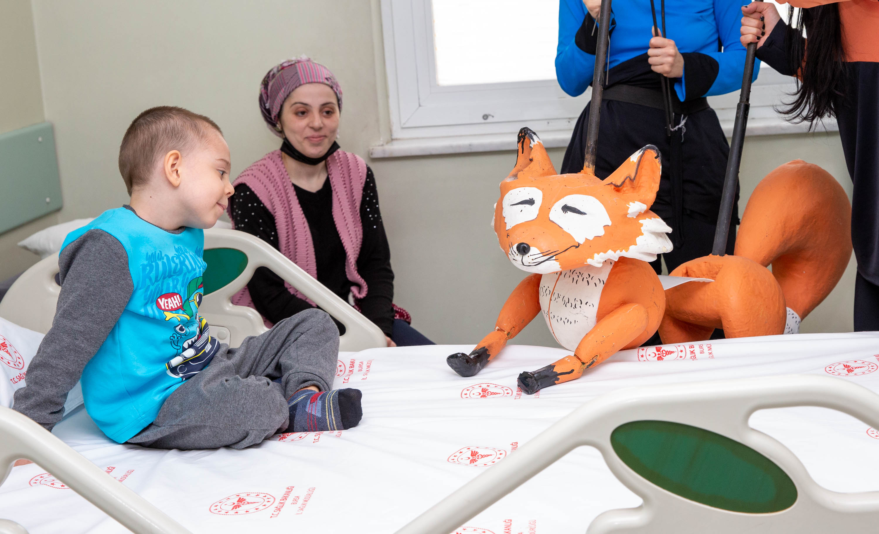 Odalarında sadece doktor ve hemşire görmeye alışkın olan nasta çocuklar, karşılarından ellerinde kocaman tilki ve kuş kuklası olan tiyatrocuların görünce büyük şaşkınlık yaşadı. Hastane odasında unutamayacakları keyifli anlar yaşayan çocuklar, kendilerine moral veren tiyatroculara teşekkür etti.