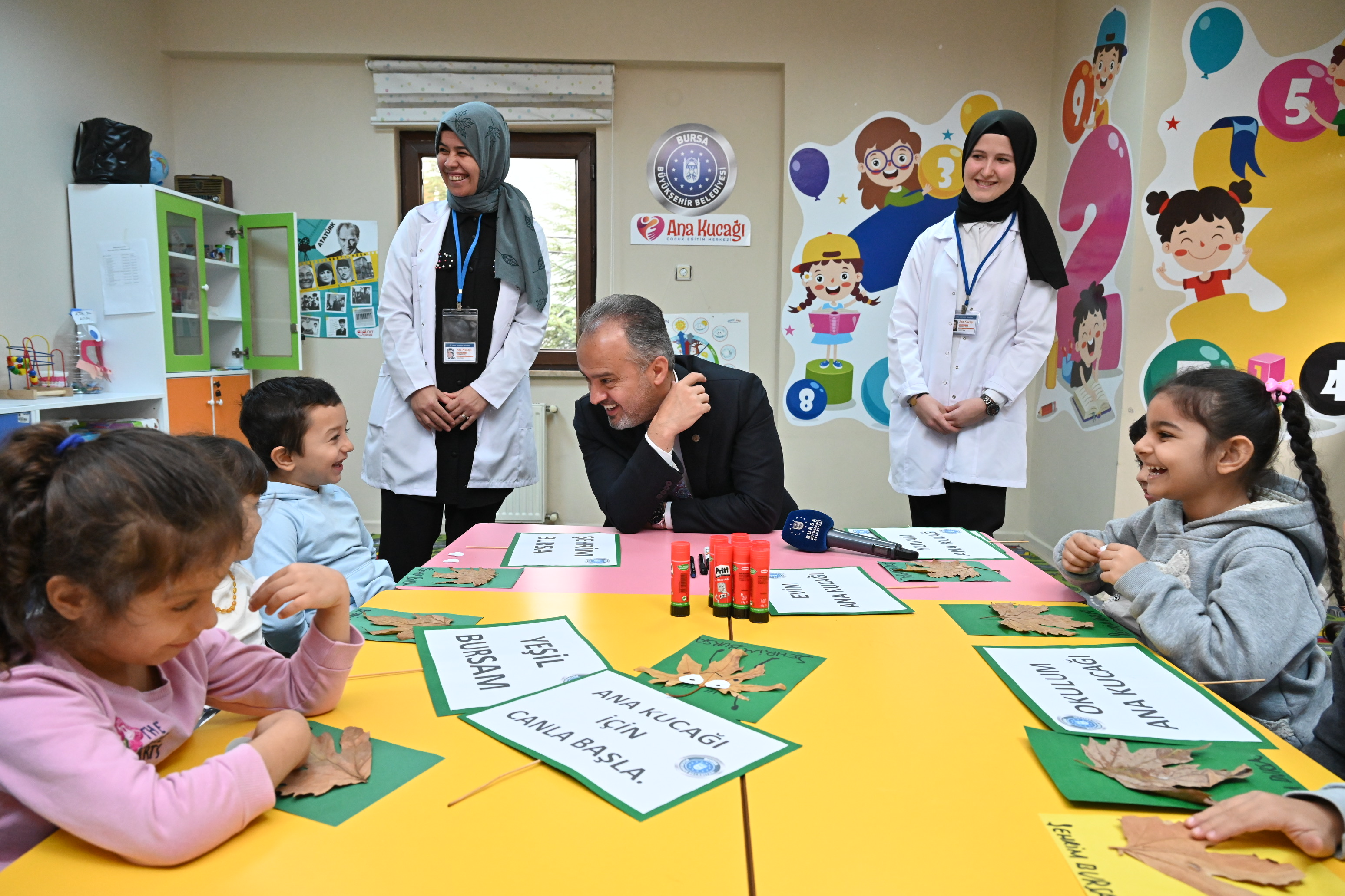 Büyükşehir Belediyesi’nin Ana Kucağı Okul Öncesi Eğitim Merkezlerinde eğitim gören minikler, ‘Şehrim Bursa’ dersinin ‘Başkanımızı Tanıyalım’ konusunu Büyükşehir Belediye Başkanı Alinur Aktaş ile birlikte işledi.