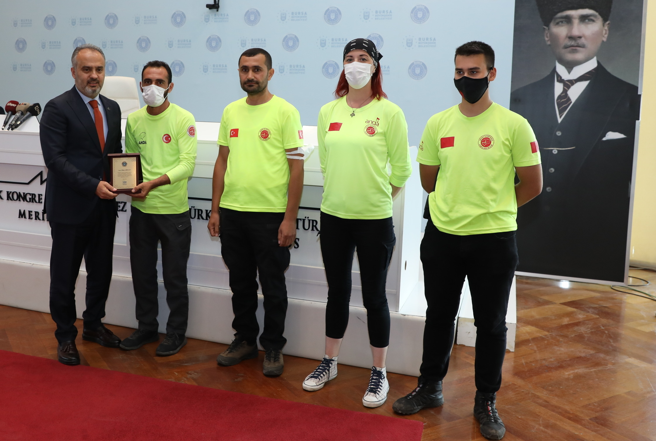 Hayatını kaybeden babasının cenazesinin hemen ardından Muğla’nın Marmaris ilçesine giderek söndürme ve arama kurtarma çalışmalarına katılan Arama Kurtarma gönüllüsü Oktay Arslan’a plaketini Büyükşehir Belediye Başkanı Alinur Aktaş takdim etti.