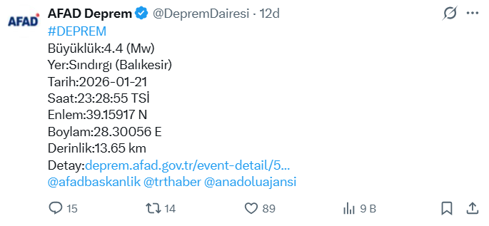 Afet ve Acil Durum Yönetimi Başkanlığı (AFAD) tarafından paylaşılan bilgilere göre, merkez üssü Sındırgı olan depremin büyüklüğü 4.4 (Mw) olarak ölçüldü. Deprem, Balıkesir genelinde, Bursa ve çevre illerde de net şekilde hissedildi.