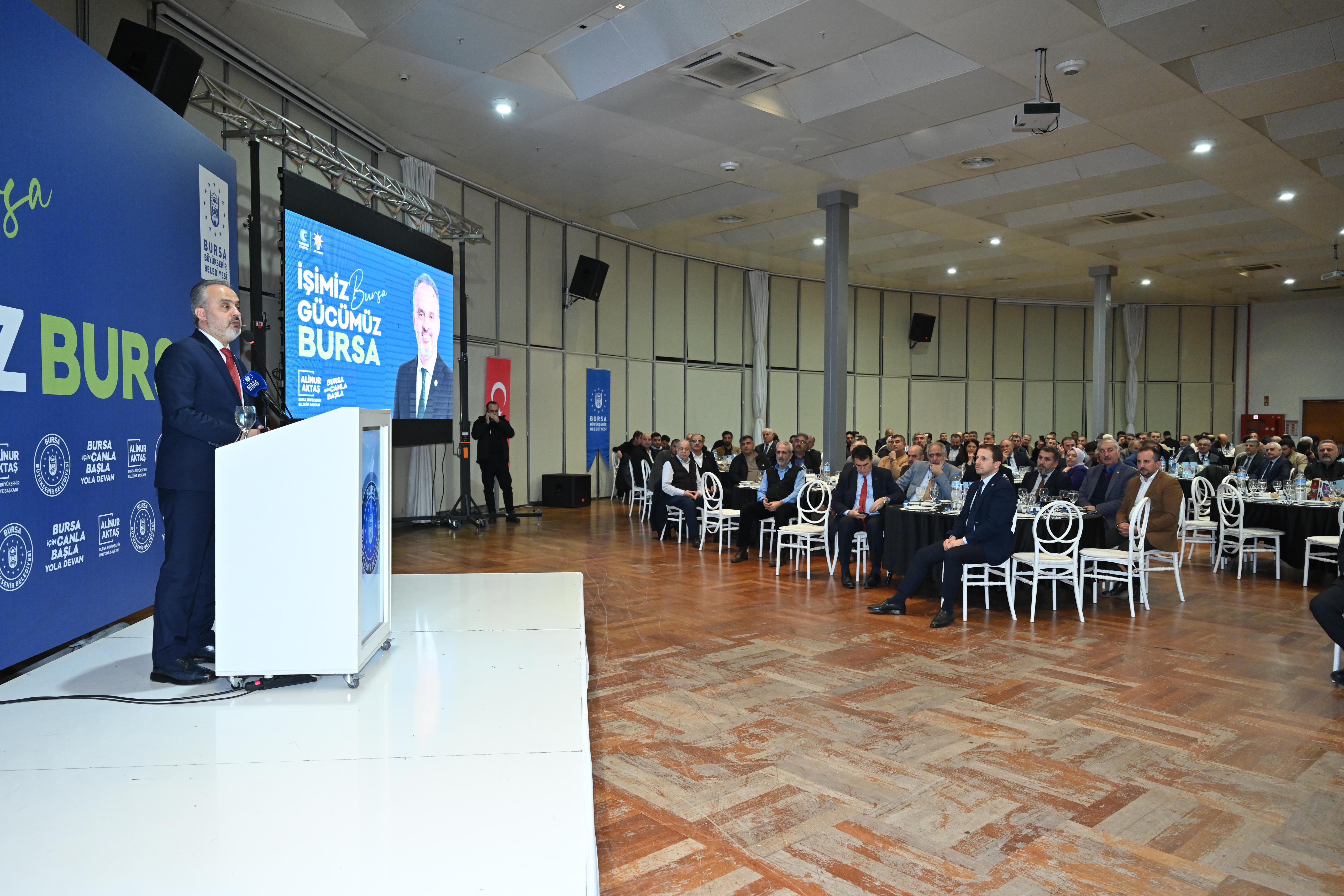 Bursa Büyükşehir Belediye Başkanı Alinur Aktaş, Doğu ve Güneydoğu sivil toplum kuruluşlarının temsilcileri ve kanaat önderleriyle Atatürk Kongre Kültür Merkezi’nde biraraya geldi. Bursa Milletvekilleri Mustafa Varank, Refik Özen, Ahmet Kılıç ve Mustafa Yavuz, Osmangazi Belediye Başkanı Mustafa Dündar, Yıldırım Belediye Başkanı Oktay Yılmaz ve siyasi parti temsilcilerinin de katıldığı programda konuşan Büyükşehir Belediye Başkanı Alinur Aktaş, farklı yörelerden 40-50 sene önce Bursa’ya gelmiş, gönlünde hem doğduğu şehri hem de yaşadığı şehri muhafaza eden insanlarla buluşmaktan mutluluk duyduğunu söyledi. Nüfusu üç buçuk milyona varan Bursa’nın ruhaniyetli bir şehir olduğunu belirten Başkan Aktaş, “Her şehrimizin ayrı ayrı güzellikleri var ama Bursa ayrı bir güzel. Her birimizin gönlü, kalbi, duası Bursa ile beraber. Bursa’nın değerli, temiz, huzurlu, güvenli, ticari aktivitesinin yüksek olması hepimiz için kıymetli. Son 5 senede ülkemizde birçok olumsuz olaylar yaşandı. Pandemi sebebiyle hayat durma noktasına geldi. Ülkenin güneyinde yangınlar, kuzeyinde seller yaşandı. Ülkemizin her bölgesine Bursa Büyükşehir Belediyesi olarak yetişmeye çalıştık. Asrın felaketi olan iki büyük depremle sarsıldık. Yaraların sarılması için bölgede güzel işler yaptık. Bu gücü bizlere Bursalılar verdi. Tüm olumsuzluklara rağmen mazeret üretmedik, söz verdiklerimizle alakalı geri durmadık. Her köşeyi ihya etmeyi, sokakları ve caddeleri düzeltmeyi, bir hayata daha dokunmayı, bir çocuğa daha burs vermeyi hesap ettik. Bursa Büyükşehir Belediyesi olarak vatandaşımızdan aldığımız güçle güzel işlere imza attık” diye konuştu.