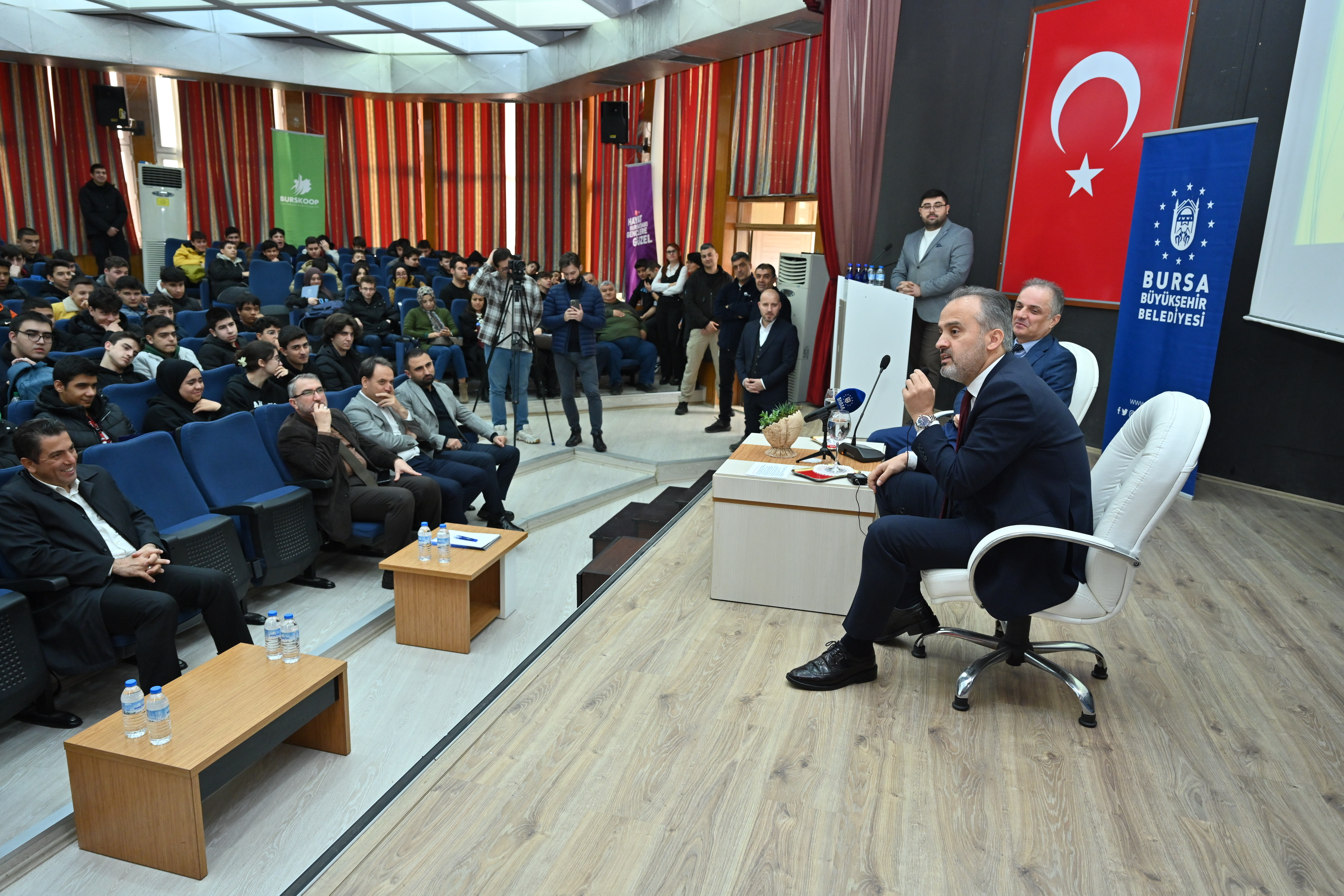 Bursa Büyükşehir Belediye Başkanı Alinur Aktaş, Ali Osman Sönmez Mesleki Teknik Anadolu Lisesi öğrencileriyle bir araya gelerek tecrübelerini ve tavsiyelerini gençlerle paylaştı. Başkan Aktaş, “Kendinize güvenirseniz yapamayacağınız hiç bir şey yok” dedi.
