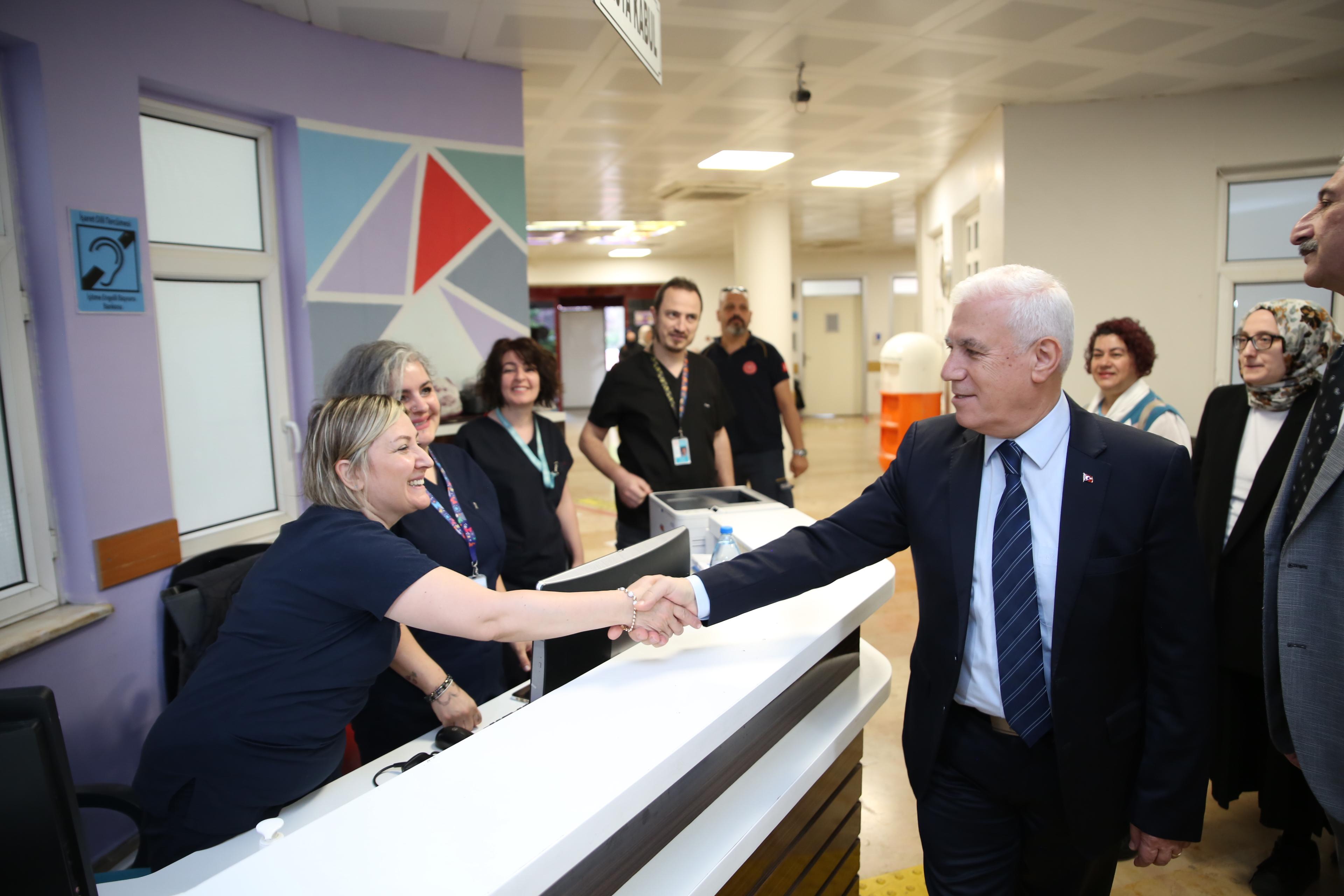 Büyükşehir Belediye Başkanı Mustafa Bozbey, Ali Osman Sönmez Onkoloji Hastanesi’nde ilk olarak Başhekim vekili Fatma Betül Orhan ve hastane yönetimiyle bir araya geldi. CHP İl Başkanı Nihat Yeşiltaş ile birlikte doktorları ve hemşireleri ziyaret eden Başkan Bozbey, sağlık çalışanlarının ‘Hemşireler Haftası’nı tebrik etti. Daha sonra tedavi gören hastalarla ve hasta yakınlarıyla buluşan Başkan Bozbey, tedavi süreçleri hakkında bilgi alarak geçmiş olsun dileklerini iletti.