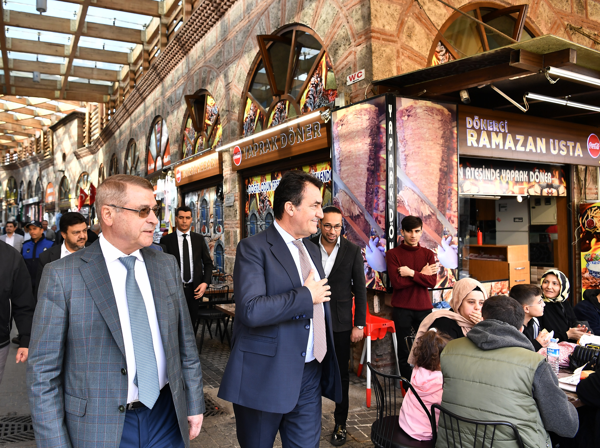 Osmangazi Belediye Başkanı Mustafa Dündar, BESOB Başkanı Fahrettin Bilgit ile birlikte Tarihi Çarşı ve Hanlar Bölgesi’ni gezerek, esnafa hayırlı işler diledi.