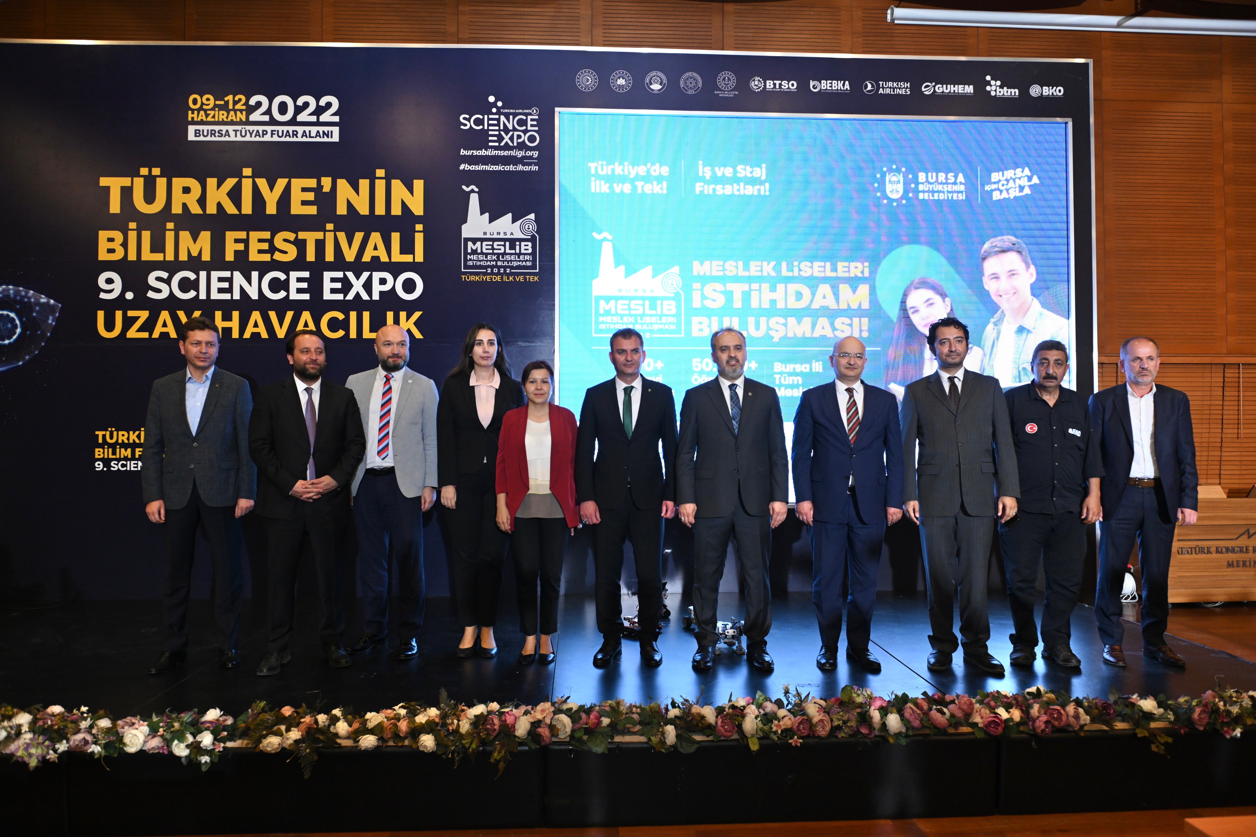 Bilimi ulaşılmaz ve zor olmaktan çıkarıp, toplumun tüm kesimlerini bilimle buluşturmak amacıyla Bursa Büyükşehir Belediyesi tarafından 2012 yılında küçük bir bilim şenliği olarak başlatılan, bugün Türkiye’nin en büyük ve dünyanın sayılı bilim festivallerinden biri haline gelen Science Expo, ‘Uzay ve Havacılık’ temasıyla 09 -12 Haziran tarihleri arasında yapılacak. Bilim meraklılarının özlemle beklediği Bursa Bilim Festivali 9. Science Expo’nun tanıtım toplantısı, Atatürk Kongre ve Kültür Merkezi’nde yapıldı.