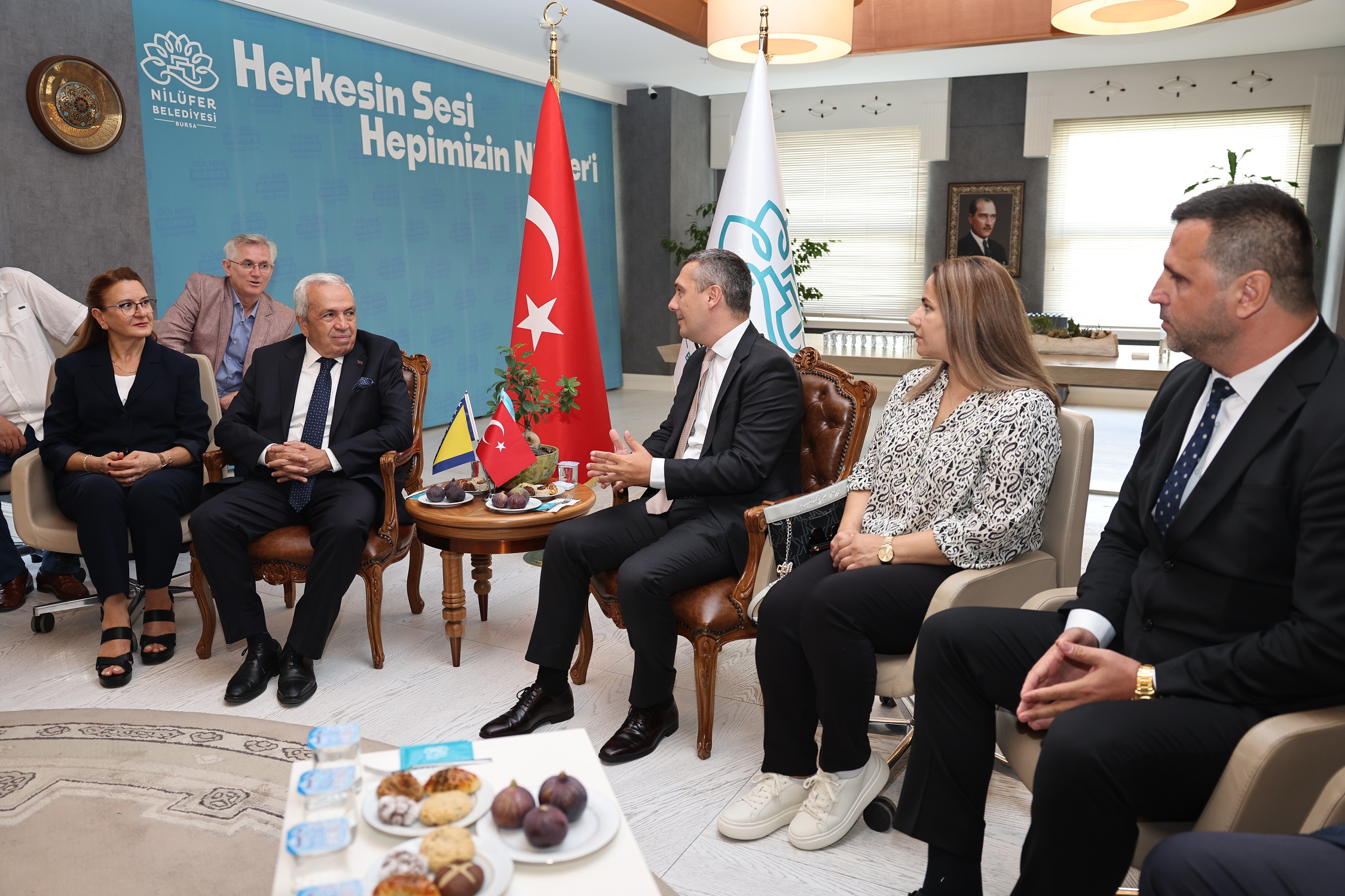 Başkan Şadi Özdemir ve eşi Nuray Özdemir’in karşıladığı konuklar önce Başkanlık makamında görüştü. Görüşmede Bosna-Hersek heyeti ile tanışmanın ardından Nilüfer Belediye Başkanı Şadi Özdemir, kent hakkında bilgi verdi.