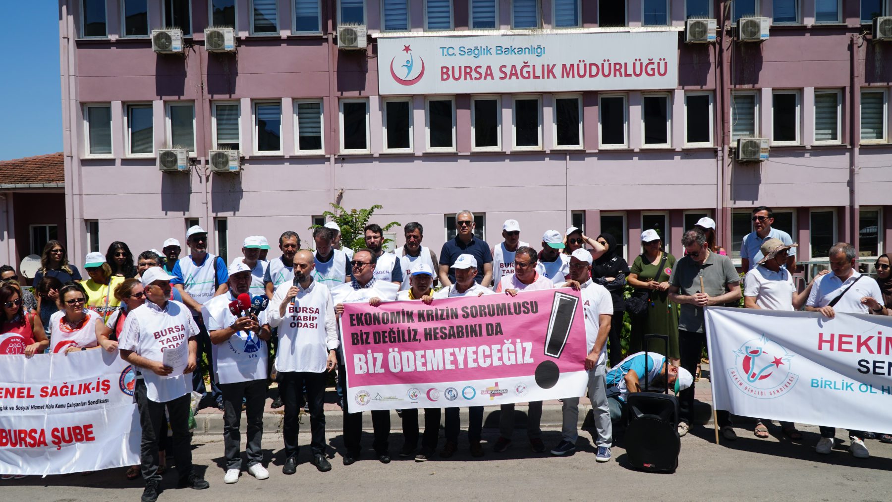Aile Sağlığı Merkezleri çalışanlarına seyyanen zammın verilmesi ve gruplandırma personelinin bakanlık kadrosuna alınması için Bursa İl Sağlık Müdürlüğü önünde bir basın açıklaması gerçekleştirildi.