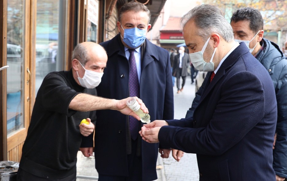 Dünyayı etkisi altına alan 'Covid 19' salgınıyla mücadele kapsamında Türkiye’de ilk vakanın görüldüğü 11 Mart’tan itibaren Bursa’da süreçten olumsuz etkilenen toplumun tüm kesimlerine yönelik sosyal destek paketlerini devreye alan Bursa Büyükşehir Belediyesi, esnafı da unutmadı. Son olarak Cumhurbaşkanlığı genelgesiyle işyeri kapanan esnafa yönelik mesken su faturalarında yüzde 50 indirim, belediye alacaklarının ötelenmesi ve gıda destek paketlerini devreye alan Bursa Büyükşehir Belediye Başkanı Alinur Aktaş, bunun yanında faaliyetlerine devam eden ancak süreçten olumsuz etkilenen esnafla sık sık bir araya geliyor. Fırsat buldukça esnaf ziyaretlerine zaman ayıran Başkan Aktaş’ın son durağı tarihi Tahtakale esnafı oldu.