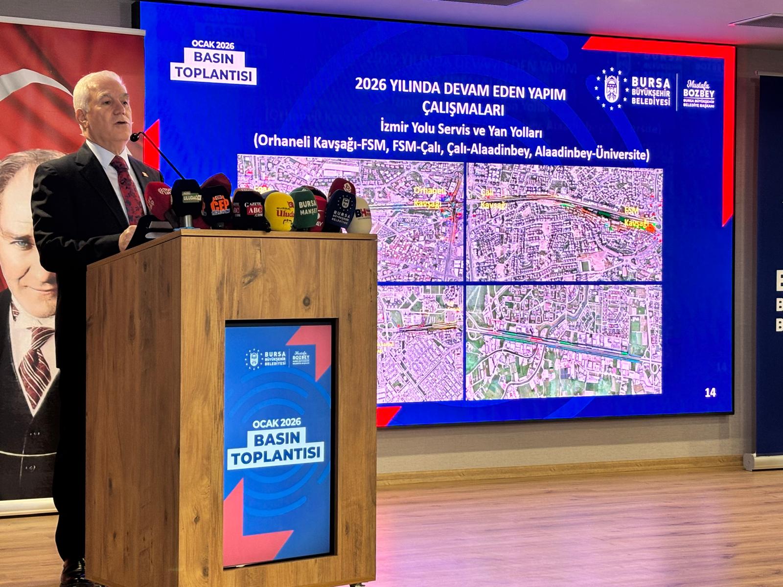 Bursa Büyükşehir Belediye binasında gerçekleştirilen toplantıda, Bursa genelinde ulaşım altyapısını güçlendirmeye yönelik sürdürülen çalışmalar ele alınırken, önümüzdeki dönemde hayata geçirilmesi planlanan yeni projeler de kamuoyu ile paylaşıldı.
