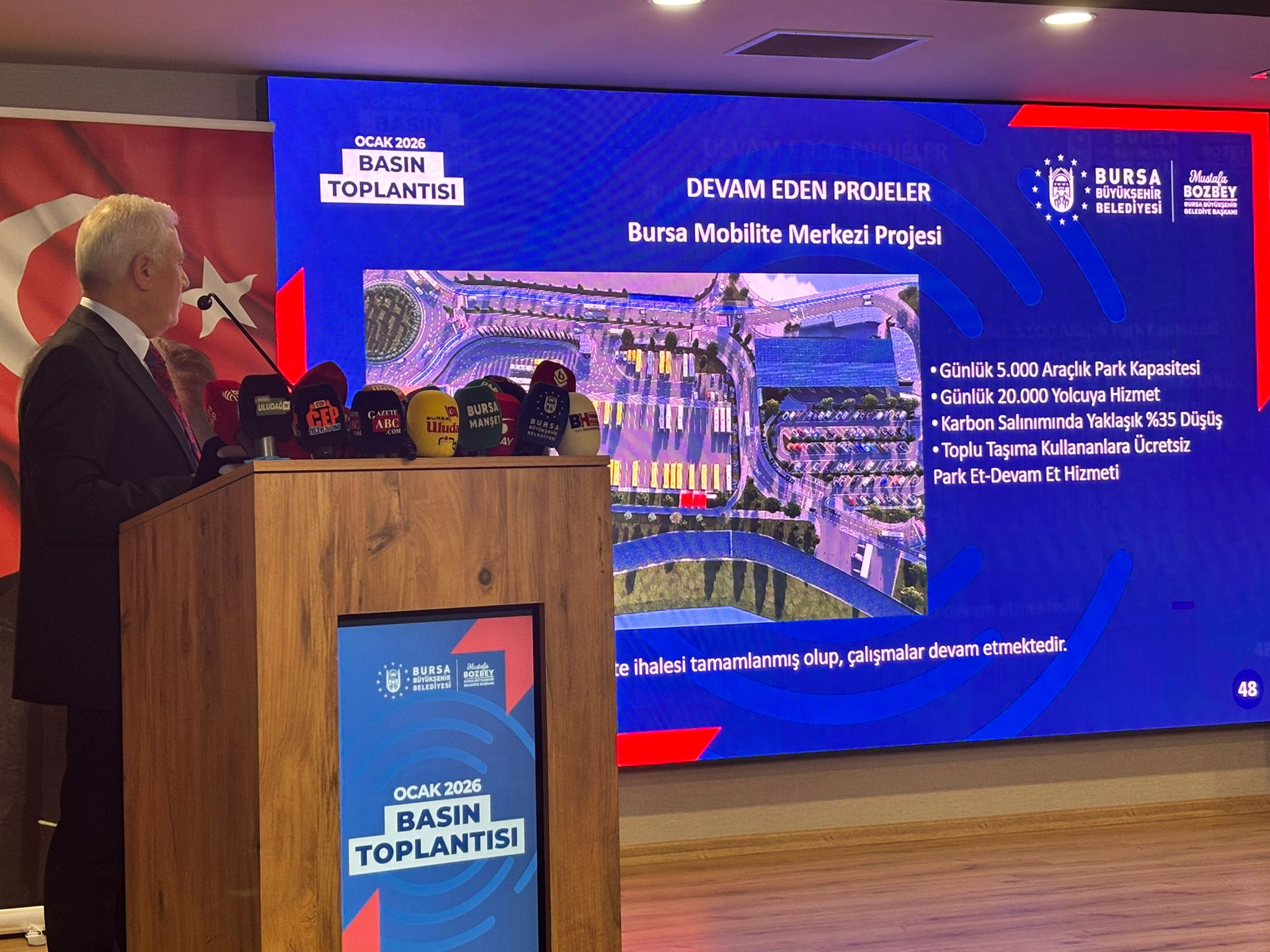 Toplu ulaşımda biniş sayıları ve yeni uygulamalar hakkında veriler sunan Başkan Bozbey, 2025 yılında Bursa’da yaklaşık 315 milyon biniş gerçekleştiğini ve toplu taşımanın kentin omurgası haline geldiğini belirtti. İlk defa kendi dönemlerinde başlatılan gece seferlerinin lüks değil bir ihtiyaç olduğunun kanıtlandığını söyleyen Bozbey, öğrencilere yönelik kart sisteminde yapılan düzenleme ile bakiye sıfırlama uygulamasını kaldırdıklarını ve öğrencilerin yükledikleri tutarı süresiz kullanmalarına olanak sağladıklarını kaydetti. Ayrıca şehir içindeki araç yoğunluğunu azaltmak adına "Park Et Devam Et" (P+R) sistemini yaygınlaştıracaklarını ve 5 bin araçlık yeni otopark projelerinin hazırlıklarının sürdüğünü dile getirdi.