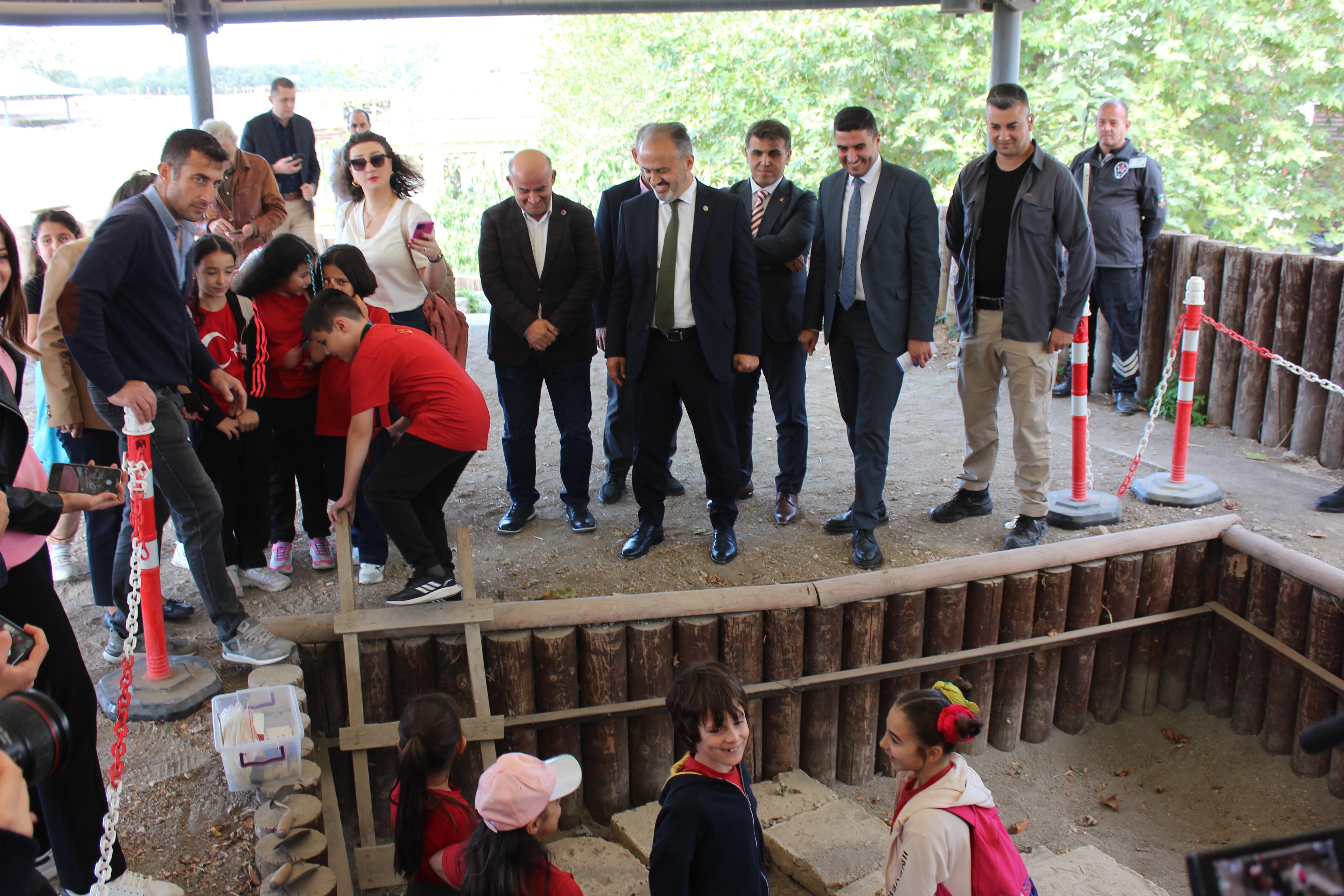 Toplantı öncesi ilkokul öğrencileriyle kazı alanına giden Bursa Büyükşehir Belediye Başkanı Alinur Aktaş, öğrencilerin arkeolojik kazı heyecanına ortak oldu.