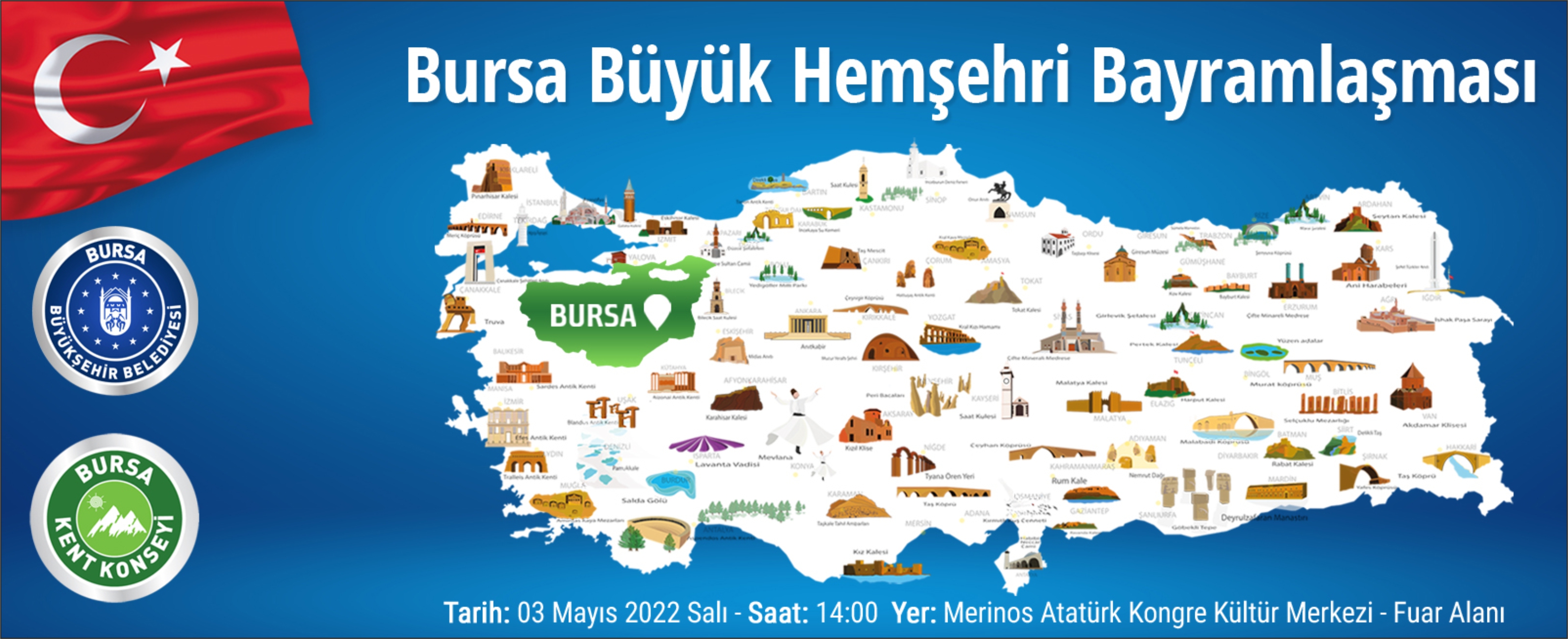 BURSA – Bursa Kent Konseyi Başkanlığınca Hemşehri Dernekleri, Federasyonları ve Konfederasyonlarının katılımıyla Ramazan Bayramı’nın ikinci günü “Bursa Büyük Hemşehri Bayramlaşması” düzenleniyor.