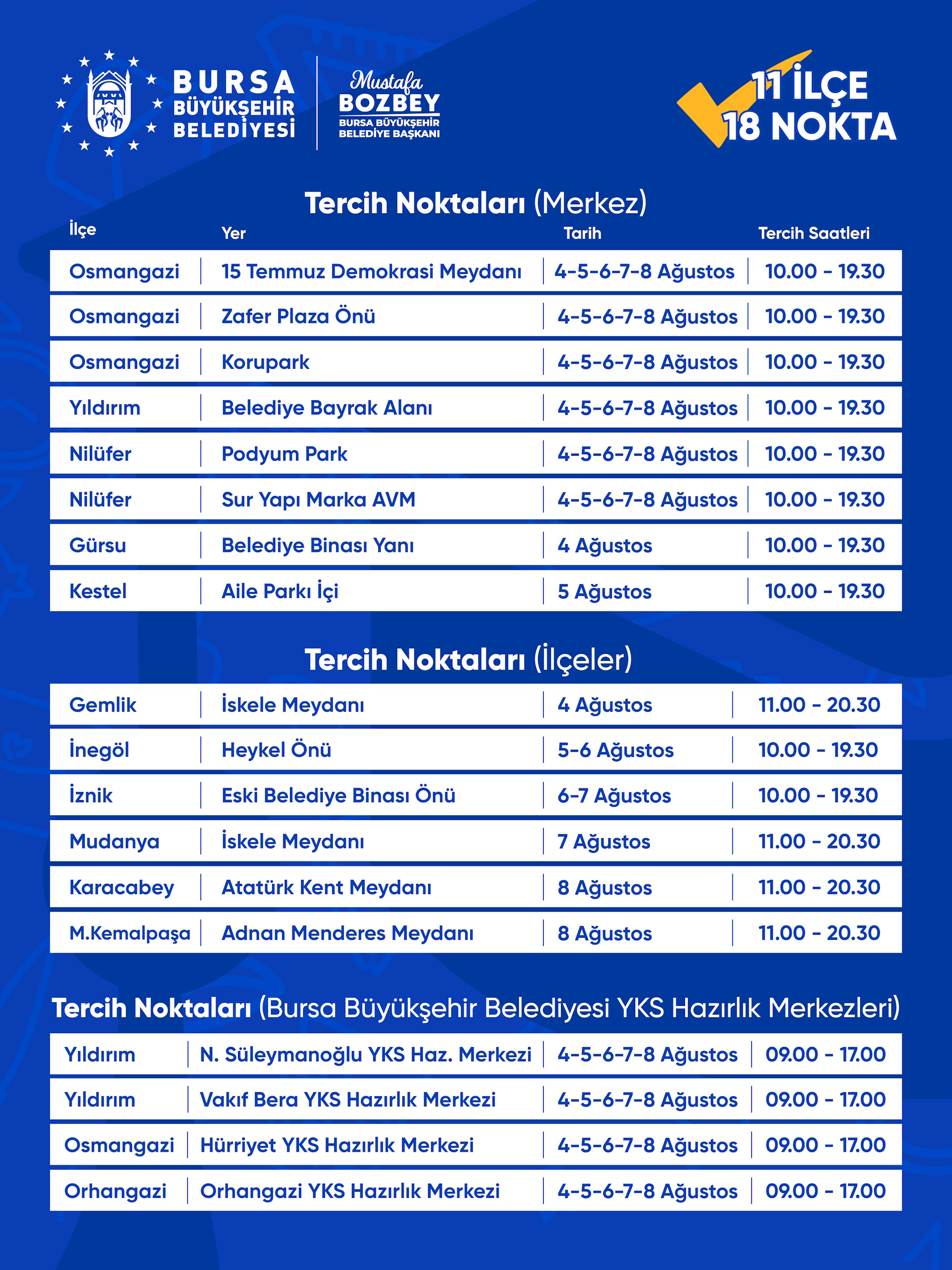 Osmangazi'de 15 Temmuz Demokrasi Meydanı, Zafer Plaza önü ve Korupark, Yıldırım'da Belediye Bayrak Alanı, Nilüfer'de Podyum Park ve Sur Yapı Marka AVM gibi işlek noktalarda 8 Ağustos'a kadar tercih danışmanlığı hizmeti sunulacak. İlçelerde ise Gemlik İskele Meydanı, İnegöl Heykel önünde 5 ve 6 Ağustos, İznik Eski Belediye Binası önünde 6 ve 7 Ağustos, Mudanya İskele Meydanı'nda 7 Ağustos, Karacabey Atatürk Kent Meydanı ve Mustafakemalpaşa Adnan Menderes Meydanı'nda ise 8 Ağustos tarihlerinde rehberlik hizmeti verilecek. Ek olarak, Yıldırım Naim Süleymanoğlu ve Vakıf YKS Hazırlık Merkezleri, Osmangazi Hürriyet YKS Hazırlık Merkezi ve Orhangazi YKS Hazırlık Merkezi'nde de danışmanlık hizmeti sağlanıyor.