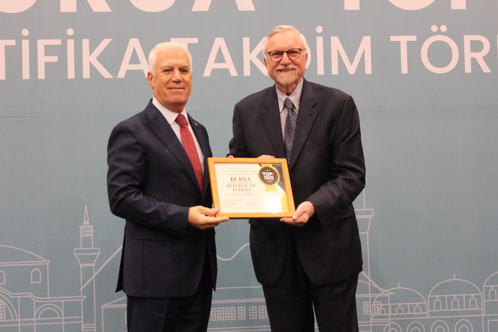 John G. Jung, Başkan Mustafa Bozbey’e sertifikayı takdim etti.
