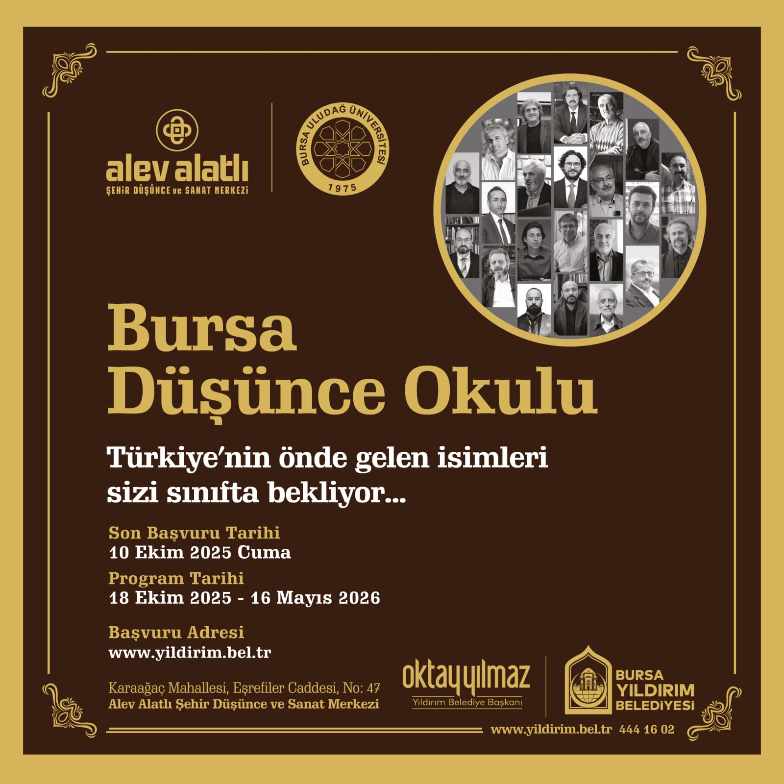 Bu kapsamda Yıldırım Belediyesi'nin, Uludağ Üniversitesi iş birliğiyle hayata geçirdiği Bursa Düşünce Okulu'na kayıtlar başladı. 20 hafta sürecek olan eğitimlerde; alanında yetkin isimler olan Prof. Dr. Mehmet Fatih Birgül, Prof. Dr. Ekrem Demirli, Prof. Dr. Ali Utku, Prof. Dr. M. Cüneyt Kaya, Prof. Dr. Kasım Küçükalp, Prof. Dr. Tahsin Görgün, Prof. Dr. Ayhan Bıçak, Prof. Dr. Derda Küçükalp, Prof. Dr. Hasan Basri Öcalan, Prof. Dr. Fırat Mollaer, Prof. Dr. Vefa Taşdelen gibi değerli akademisyenler, katılımcılara rehberlik edecek. Katılımcıların çok yönlü gelişimini desteklemek, onları okumaya, araştırmaya ve düşünmeye teşvik etmek amacıyla düzenlenen Bursa Düşünce Okulu'na başvurular, 10 Ekim'e kadar Yıldırım Belediyesi'nin resmi web sitesindeki duyurular bölümünden yapılabilecek. Başvuruda bulunan adaylar, 11-12 Ekim tarihlerinde gerçekleştirilecek mülakatlarla belirlenecek. ‘Düşünce-Bilgi-Bilim’, ‘Medeniyet-Kültür-Tarih’ ve ‘Sanat-Edebiyat-Ahlak’ temaları altında oluşturulan dersler, 18 Ekim'de başlayıp 16 Mayıs'ta sona erecek. Bursa Düşünce Okulu'nu başarıyla tamamlayan katılımcılara sertifikaları, 16 Mayıs'ta Yıldırım Belediye Başkanı Oktay Yılmaz tarafından takdim edilecek.