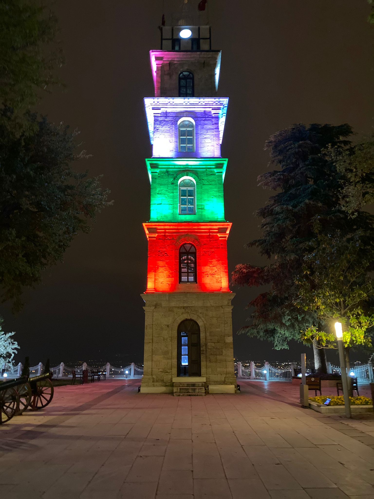 Bursa Büyükşehir Belediyesi, İsrail'in Mescid-i Aksa'ya yaptığı saldırı ve Filistin halkına yaptığı zulme tepki göstermek amacıyla Tophane’deki tarihi saat kulesini Filistin Bayrağı’nın renkleriyle ışıklandırdı.
