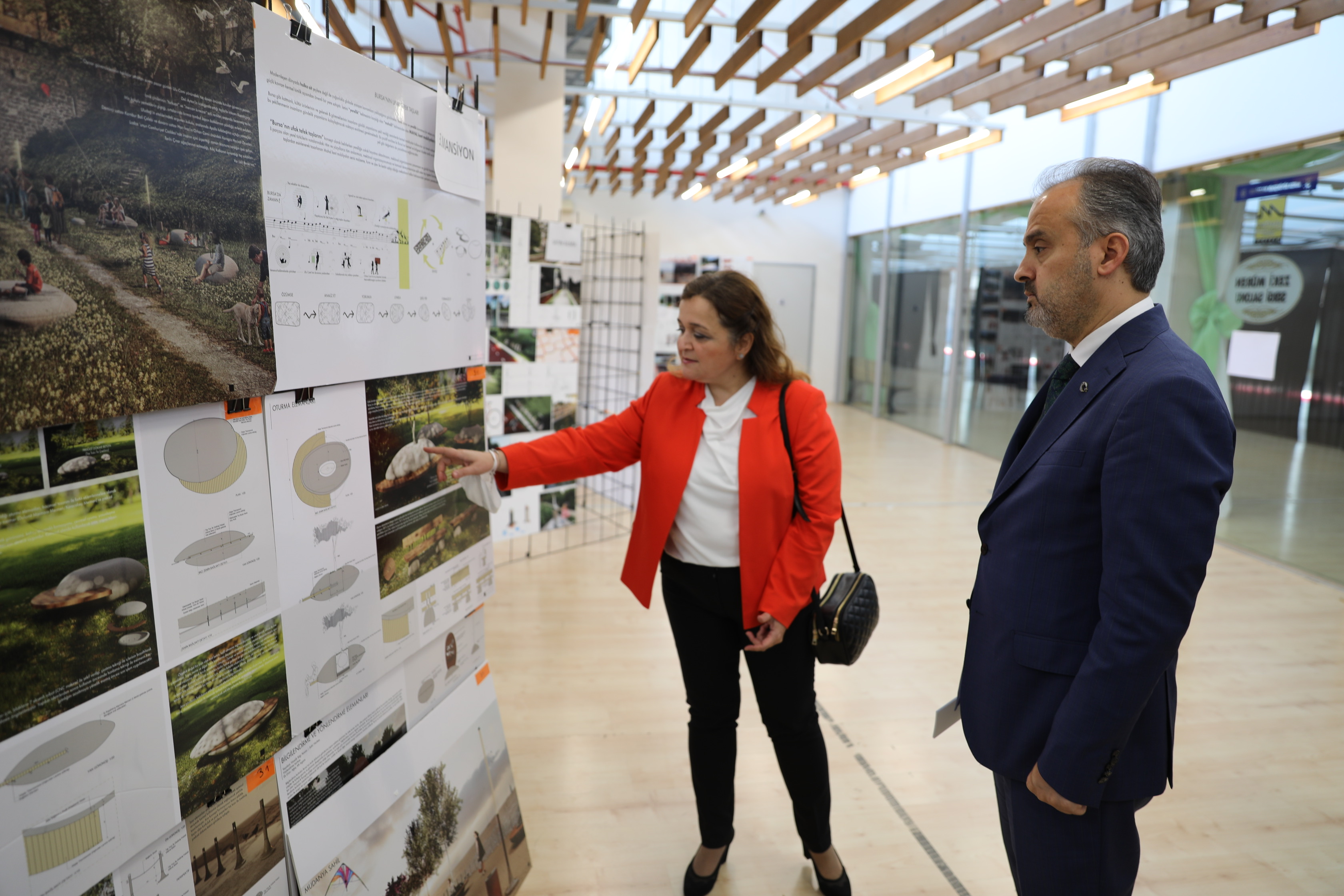 Atatürk Kongre Kültür Merkezi Zeki Müren Sergi Salonu’ndaki proje sergi alanını gezen Bursa Büyükşehir Belediye Başkanı Alinur Aktaş, Uludağ Üniversitesi Mimarlık Bölüm Başkanı Prof. Dr. Mimar Tülin Vural Arslan’dan katılan projeler ve değerlendirme süreci hakkında bilgi aldı. Yapılan çalışmaları tek tek inceleyen Başkan Aktaş, yarışmaya katılarak katkı sunan tüm mimarlara teşekkür etti. Şehirlerin doğal, kültürel, tarihi, mimari, sosyal ve yapay birçok öğenin karşılıklı etkileşim içinde olduğu dinamik alanlar olduğunu söyleyen Başkan Aktaş, dünyada birçok şehrin bu etkileşimi planlı ve kontrollü bir şekilde gerçekleştirdiğini belirtti. Bunun neticesinde yapılan uygulamalardan bazılarının akılda kaldığını ifade eden Başkan Aktaş, “Bursa birçok özelliği bağrında barındırıyor. Farklı medeniyetlere ev sahipliği yaptı. Türkiye’nin de en dinamik şehirlerinden biri olmuştur. Bursa Büyükşehir Belediyesi olarak zengin tarihin devamı olan bir hayalimiz var. Ulaşımdan sanayiye, tarımdan turizme her alanda hedeflerimiz var. Gelecek kuşaklara aktarmak istediğimiz önemli değerler var. Bu amaçla Kent Mobilyaları Tasarım Yarışması’nı başlattık. Şehrin bulvar, cadde, meydanlarında bize has farklı tasarımlar olmasını arzu ediyoruz. Bu doğrultuda 21 Haziran 2021’de yarışmayı ilan ettik” dedi.