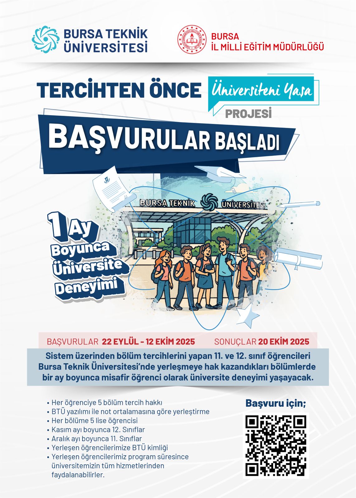 BTÜ, Bursa İl Milli Eğitim Müdürlüğü ile iş birliği yaparak, lise öğrencilerine üniversite atmosferini yaşatacak örnek bir projeye öncülük ediyor. "Tercihten Önce Üniversiteni Yaşa" projesiyle, Bursa'daki lise 3 ve 4. sınıf öğrencileri, üniversite tercihleri öncesinde hayallerini süsleyen bölümlerde doğrudan eğitime katılarak, geleceklerine yönelik daha isabetli kararlar verebilecekler. BTÜ, Kasım ayında 12. sınıf öğrencilerini, Aralık ayında ise 11. sınıf öğrencilerini ağırlayacak.