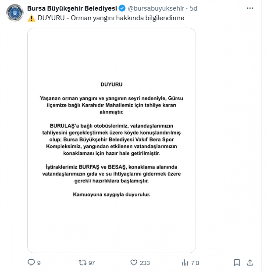 Bursa Büyükşehir Belediyesi’nden yapılan açıklamada, yangının etkilediği Gürsu'ya bağlı Karahıdır köyünün tahliye edildiği belirtildi. Bölgedeki vatandaşların tahliyesi için BURULAŞ’a ait araçların görevlendirildiği açıklandı.