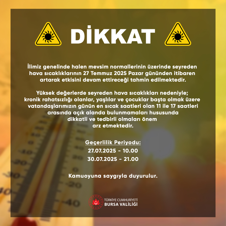 Bursa Valiliği tarafından yayımlanan uyarıda, şehir genelinde 27 Temmuz’dan itibaren etkili olması beklenen sıcak hava dalgasına dikkat çekildi. Hava sıcaklıklarının 4 gün boyunca mevsim normallerinin 5 ila 8 derece üzerine çıkacağı belirtildi.