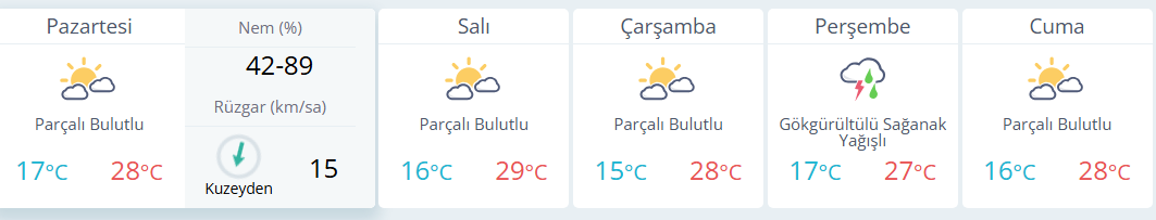18 Eylül Perşembe günü ise güneşli hava yerini gök gürültülü yağışa bırakacak; sıcaklık 27/17 derece aralığında seyredecek.