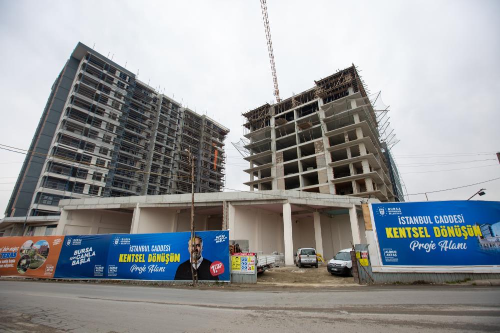 Bursa’nın İstanbul’a açılan kapısı olan ancak ‘plansız yapılar ve düzensiz tamirhanelerle’ görüntü kirliliğinin yaşandığı İstanbul Caddesi’nin modern görünüm kazanması amacıyla başlatılan Kentsel Dönüşüm Projesi’nde bugüne kadar 55 bina ve 140 bağımsız bölümün yıkımı tamamlandı. Mevcut hak sahipleri ile uzlaşma oranının yüzde 95'e ulaştığı proje alanı içerisinde, mülkiyeti Büyükşehir'e ait 11 bin metrekare alanda yüklenici firma tarafından yapılan inşaat hızla devam ediyor. Mayıs ayı içerisinde inşaatın tamamlanması hedeflenirken; proje 193 konut, 118 ofis ve 30 dükkândan oluşuyor. Bunlardan Büyükşehir Belediyesi'ne kalacak olan 103 konut, 77 ofis ve 13 dükkân, bölgenin dönüşüm projesinde rezerv olarak kullanılıyor.