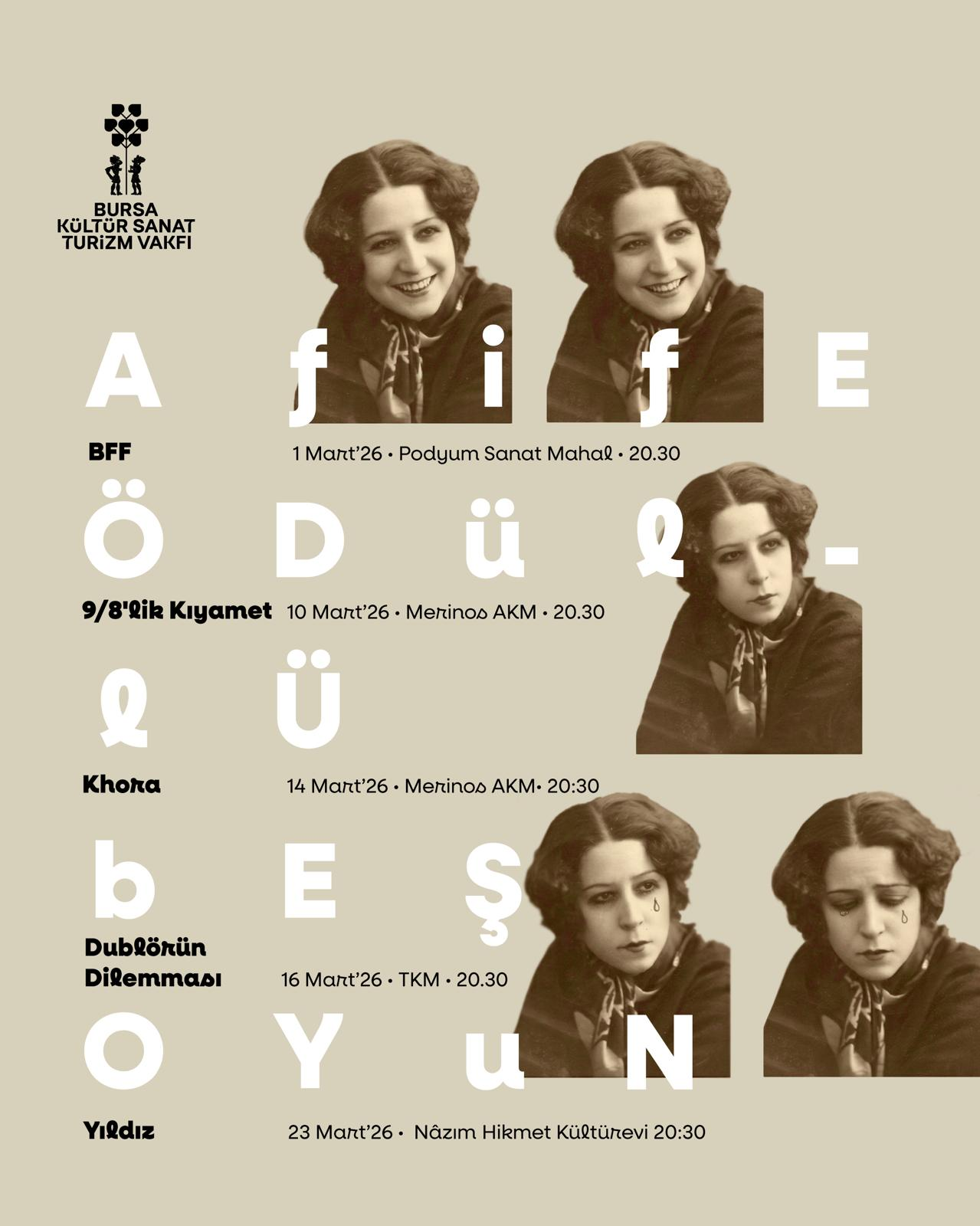 Bursa Kültür Sanat ve Turizm Vakfı (BKSTV) iş birliğiyle düzenlenen "Afife Tiyatro Günleri", Afife Tiyatro Ödülleri’ne layık görülmüş 5 seçkin yapımı Bursalı izleyicilerle buluşturacak.