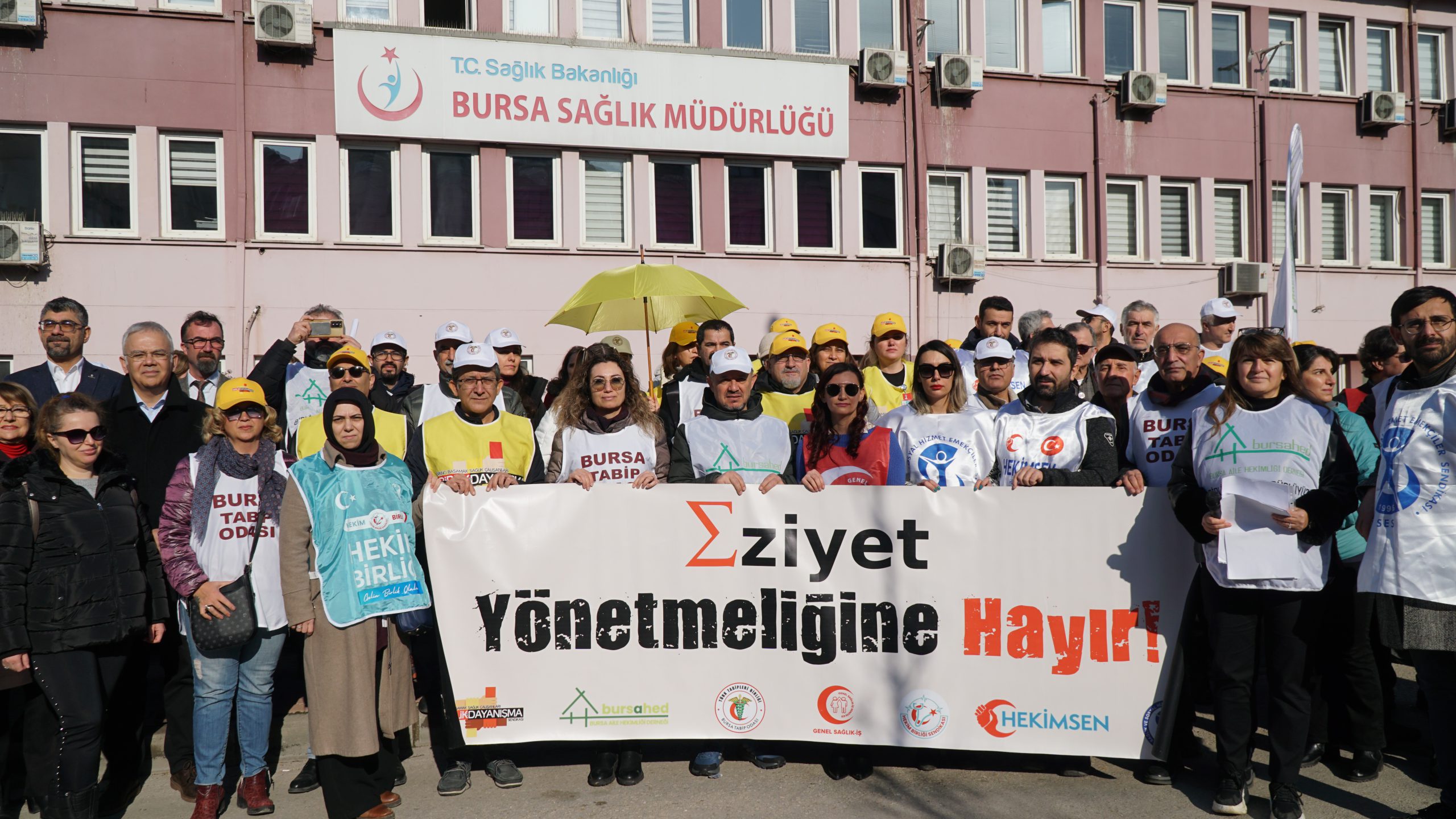 Bursa Tabip Odası (BTO), Genel Sağlık İş Sendikası Bursa Şubesi, HEKİM SEN Bursa Şubesi, Hekimler Birliği Sendikası Bursa Şubesi, Sağlık ve Sosyal Hizmetler Emekçileri Sendikası Bursa Şubesi (SES), Bursa Aile Hekimleri Derneği (BURSAHED) ile Birlik ve Dayanışma Sendikası’nın çağrısıyla Bursa İl Sağlık Müdürlüğü önünde bir araya gelen sağlık çalışanları basın açıklaması gerçekleştirdi.