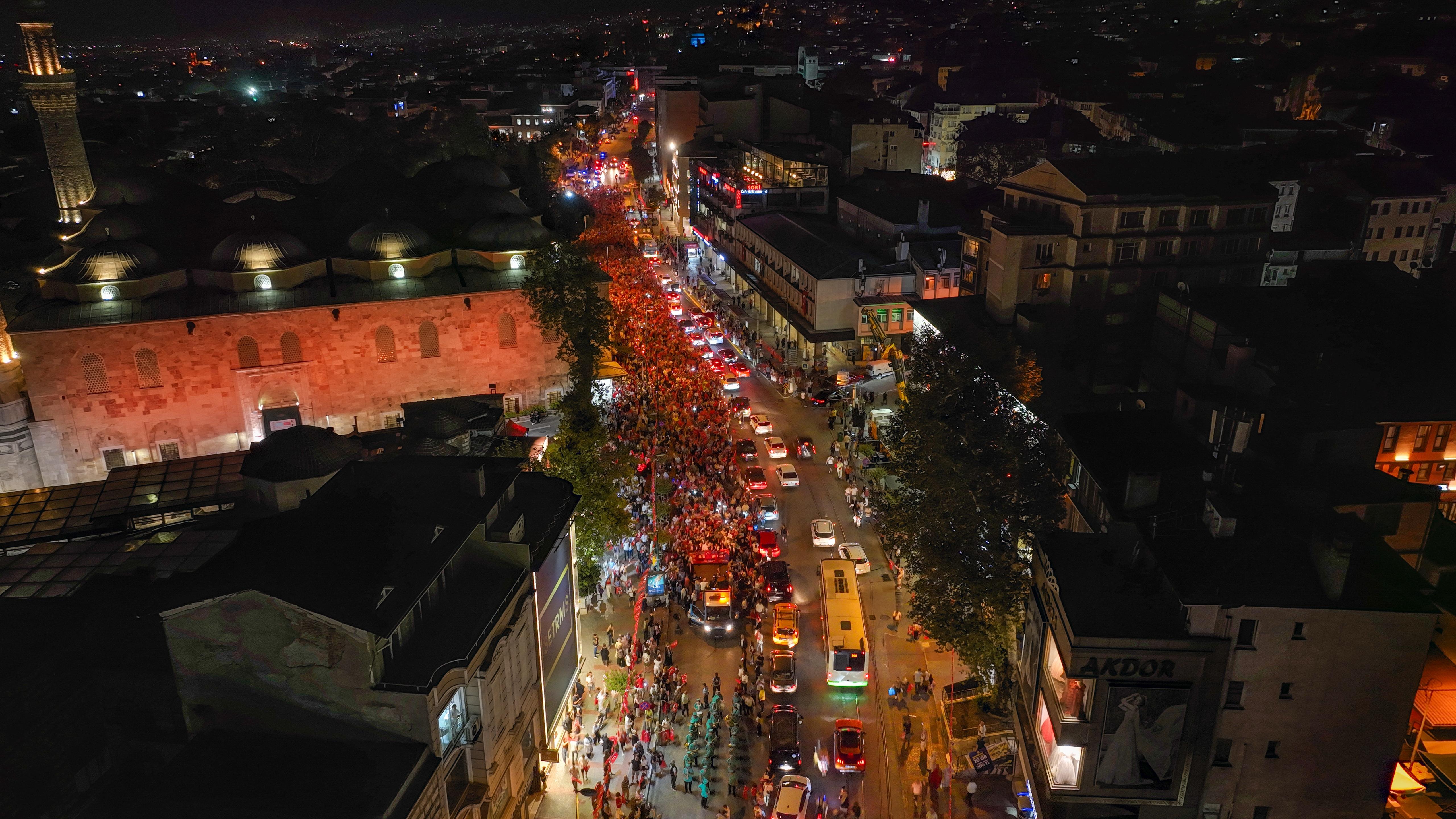 30 Ağustos Zafer Bayramı'nın 103. yıl dönümü, ülke genelinde olduğu gibi Bursa'da da büyük bir heyecanla kutlandı. Gündüz etkinliklerinin ardından on binlerce Bursalı, Bursa Büyükşehir Belediyesi'nin organize ettiği fener alayı yürüyüşü için Tarihi Belediye Binası önünde bir araya geldi. Yürüyüşe Bursa Büyükşehir Belediye Başkanı Mustafa Bozbey ve eşi Seden Bozbey'in yanı sıra CHP İl Başkanı Nihat Yeşiltaş, CHP Parti Meclis Üyesi Canan Taşer, milletvekilleri, ilçe belediye başkanları, siyasi partilerin temsilcileri ve çok sayıda davetli de iştirak etti. Atatürk Caddesi'ni tamamen dolduran binlerce vatandaş, ellerindeki meşaleler, Türk bayrakları ve pankartlarla Kültürpark Atatürk Stadyumu Meydanı'na kadar coşkuyla yürüdü. Meşaleler ve pankartlarla yan yana yürüyen Bursalılar, akıllarda yer edecek bir tablo oluşturdu.