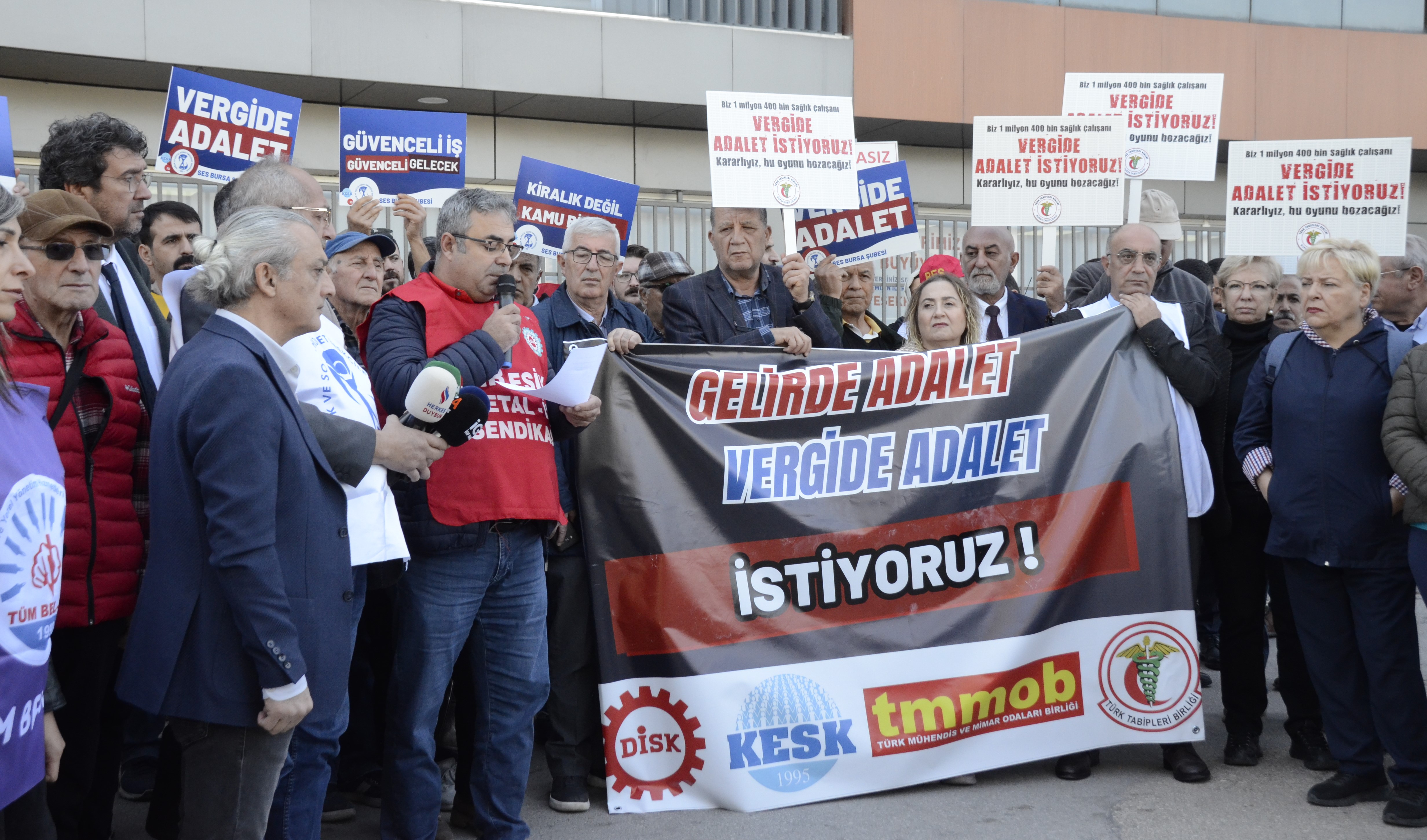 Bursa Vergi Dairesi önünde, DİSK, KESK, TMMOB ve TTB bileşenleri, "Vergide Adalet İstiyoruz" başlıklı bir basın açıklaması gerçekleştirdi. Açıklamada, "Artık yeter, geçinemiyoruz. Kararlıyız bu oyunu bozacağız" ifadeleri öne çıktı.
