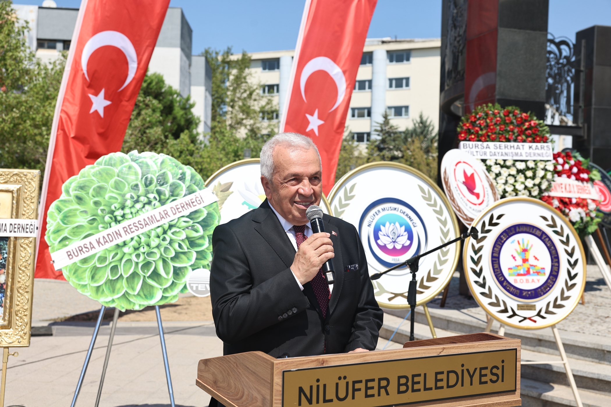 Nilüfer Belediye Başkanı Şadi Özdemir, 30 Ağustos Zafer Bayramı'nı tebrik ederek başladığı konuşmasında, "Bugün, bizler için hem bir zafer hem de bir gurur günüdür. Bugün, Ulu Önder Mustafa Kemal Atatürk'ün başkomutanlığında Dumlupınar'da destan yazılan gündür. Ülkenin işgal altında olduğu bir dönemde, özgürlüğe ve demokrasiye doğru atılan büyük adımın, Atatürk ve silah arkadaşlarının aziz hatıralarına duyduğumuz minneti ifade ettiğimiz bir gündür" şeklinde konuştu.