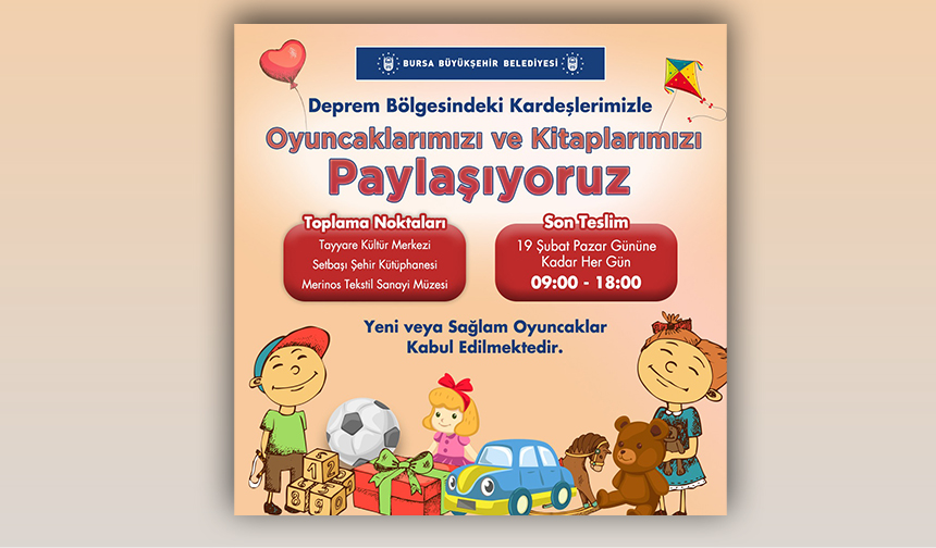 Depremin yaralarının bir an önce sarılması için arama kurtarmadan enkaz kaldırmaya, altyapı ve yol bakımlarından sosyal yardımlara kadar her alanda yoğun bir çalışma sergileyen Bursa Büyükşehir Belediyesi, deprem mağduru çocukları da unutmadı. Başlatılan kampanya ile toplanacak oyuncak ve kitaplar, bölgedeki deprem mağduru çocuklara ulaştırılacak.