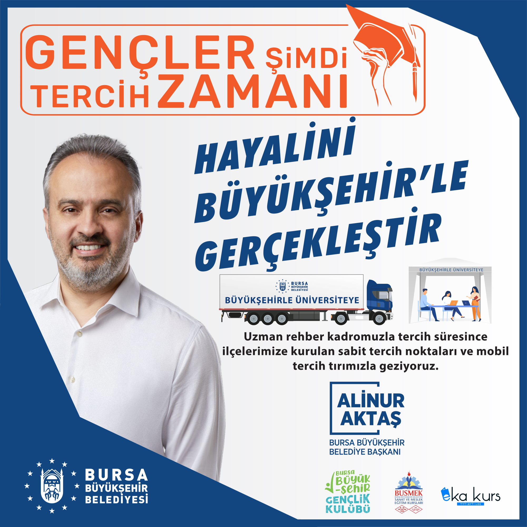 Üniversite adaylarının heyecanla beklediği Yüksek Öğretim Kurumları Sınavı (YKS) sonuçları açıklandı. Sonuçların açıklanmasıyla da tercih heyecanı başladı. Bursa Büyükşehir Belediyesi Gençlik ve Spor Hizmetleri Dairesi Başkanlığı ve BUSMEK koordinesinde, Eka Kurs Merkezi işbirliği ile uzman eğitmen rehber kadrosu eşliğinde 5 – 18 Ağustos 2021 tarihleri arasında sabit tercih noktaları ve mobil tercih tırı ile üniversite adaylarına rehberlik hizmeti verilecek.