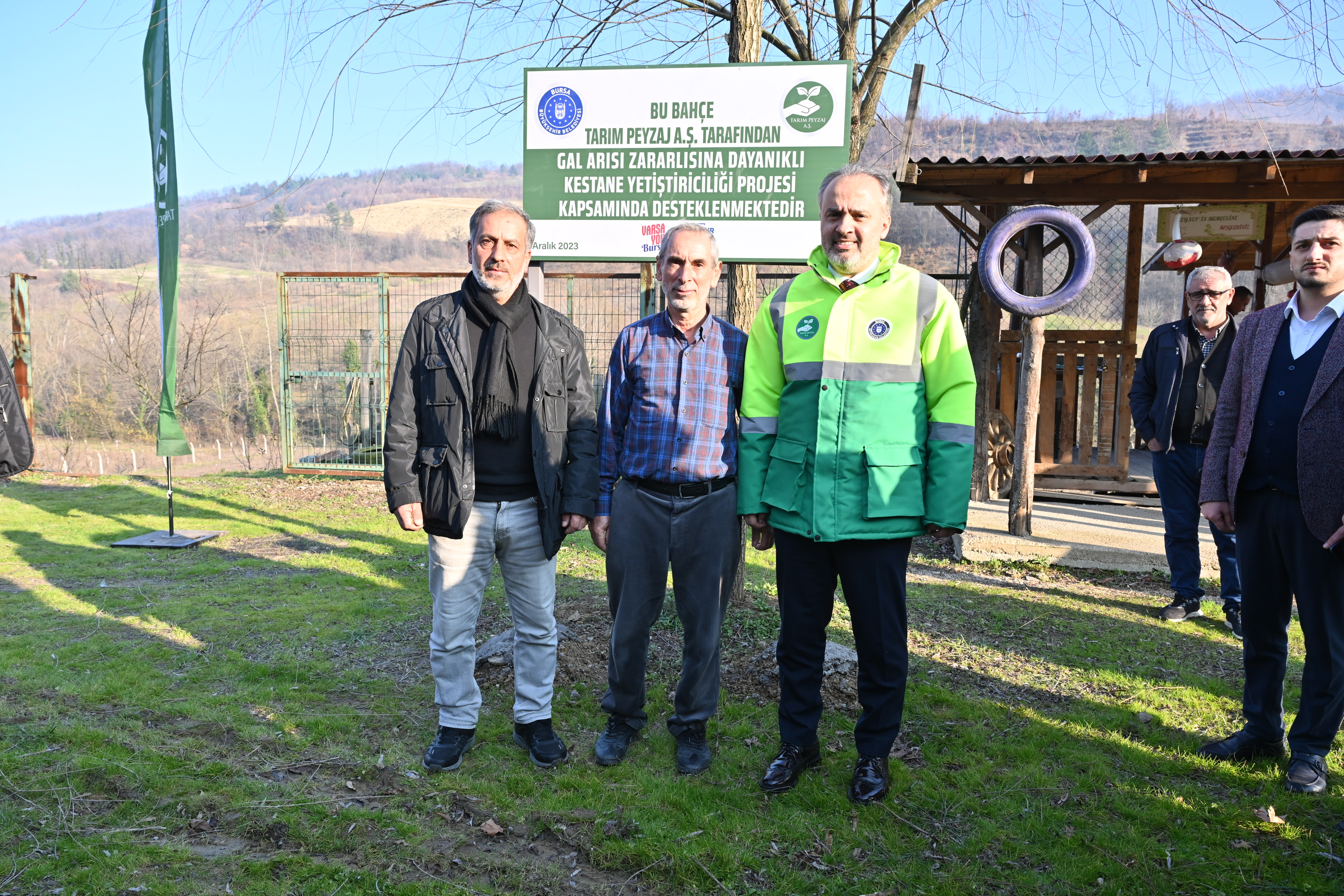 Bursa’nın sembollerinden birisinin de kestane şekeri olduğunu söyleyen Başkan Aktaş, kestane ağaçlarındaki meyve oluşumuna ve ağaçların gelişimine büyük zararı dokunan, ‘katil arı’ olarak da bilinen ‘gal arıları’ Türkiye’de de görülmeye başlandığını belirtti. Bu hastalıkla mücadele noktasında yeni bir kestane türünün geliştirilmesi gerektiğini anlatan Başkan Aktaş, “Bu kapsamda Tarım Peyzaj AŞ aracılığıyla 21 üreticimize gal arısına dayanıklı kestane fidanı dağıttık. Bu sayıyı arttırmaya devam edeceğiz. Bu fidanları yüzde 80 hibeyle verdik. Birkaç sene içerisinde etkisini çok daha fazla göreceğiz. Ürünlerimiz bereketli olsun. Fidanları alanlar hayrını görsün. Projede emeği geçenlere teşekkür ediyorum” diye konuştu.