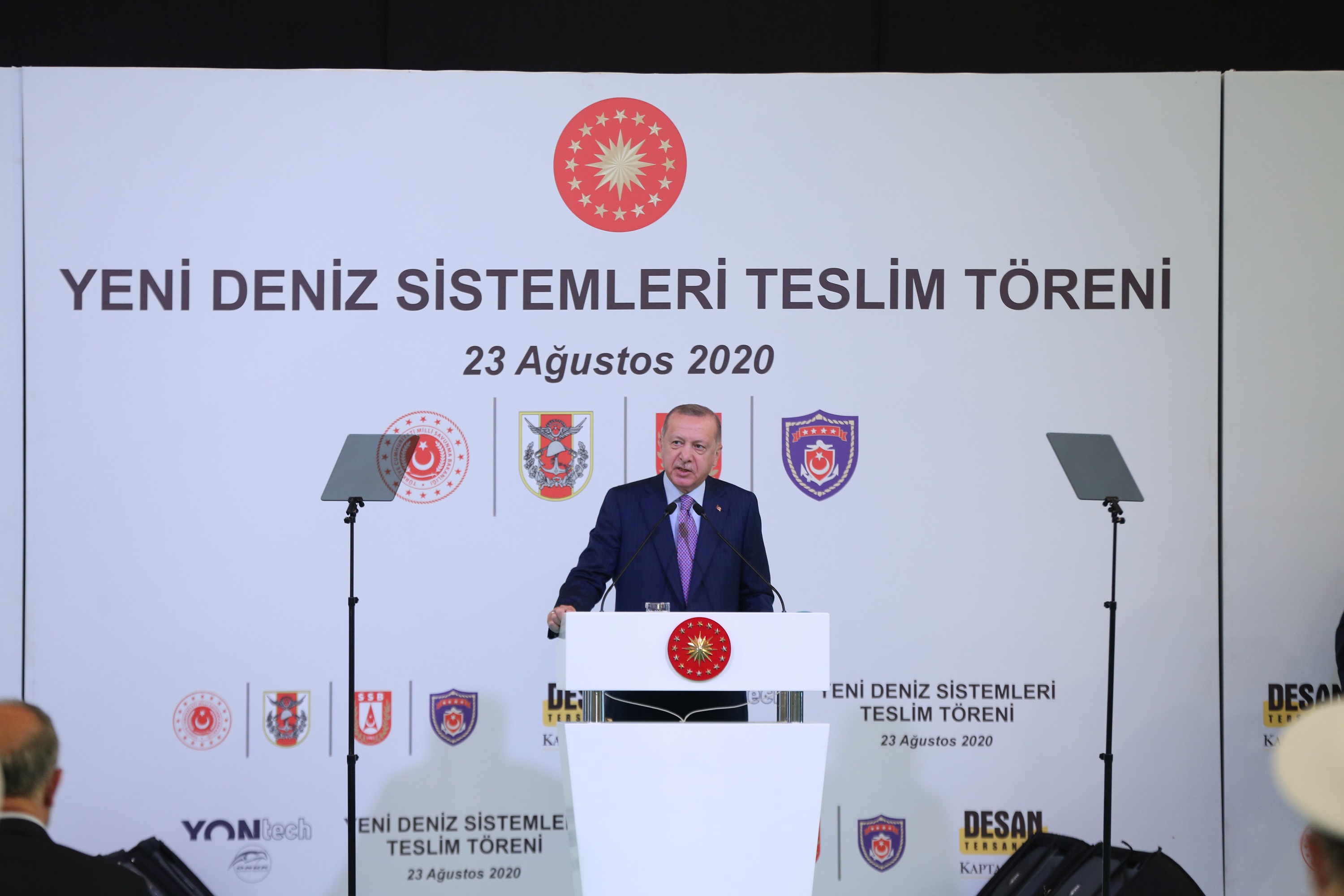 Yerli ve milli savunma sanayii çalışmalarına hız veren Türkiye, donanma yatırımlarına devam ediyor. Desan Tersanesi’nde Cumhurbaşkanı Recep Tayyip Erdoğan’ın katılımıyla gerçekleştirilen Yeni Deniz Sistemleri Teslim Töreni’nde 2 adet Acil Müdahale ve Dalış Eğitim Botu, 2 adet yeni SAT botu ve 8 adet süratli devriye botu Deniz Kuvvetleri Komutanlığı’na teslim edildi. Törende yaptığı konuşmada Desan başta olmak üzere gemi üreticilerine seslenen Cumhurbaşkanı Erdoğan, “Burada Türkiye’nin en büyük tersanelerinin sahipleriyle bir aradayız. Diyorum ki Anadolu’nun ardından ikinci, üçüncü uçak gemilerini inşa edelim” çağrısında bulundu.