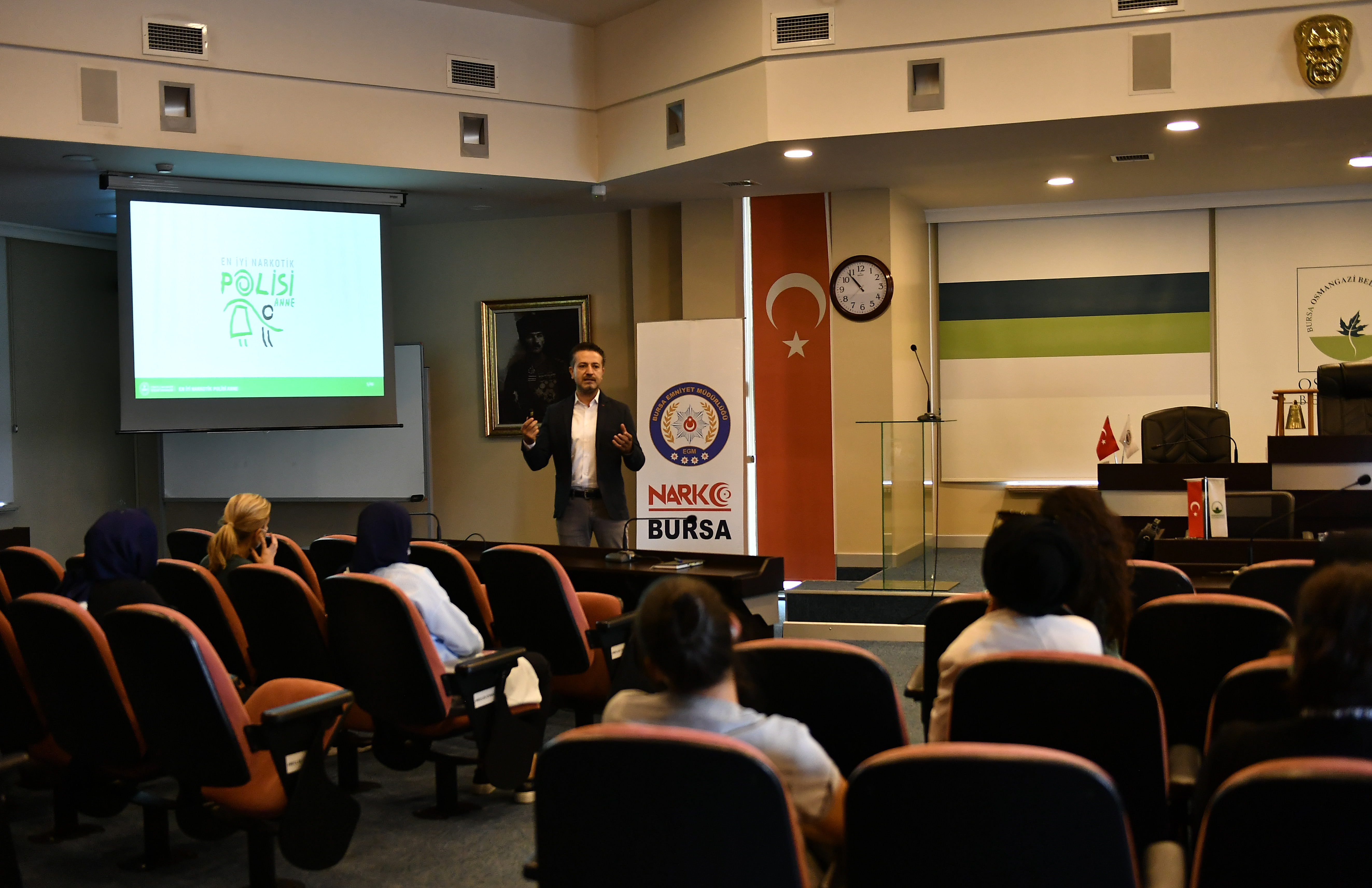 Bursa İl Emniyet Müdürlüğü Narkotik Suçlarla Mücadele Şube Müdürlüğü’nde görevli Narko Rehber Mustafa Volkan Tahpur, Osmangazi Belediyesi’nin kadın personeline “En İyi Narkotik Polisi; Anne” eğitimi verdi.