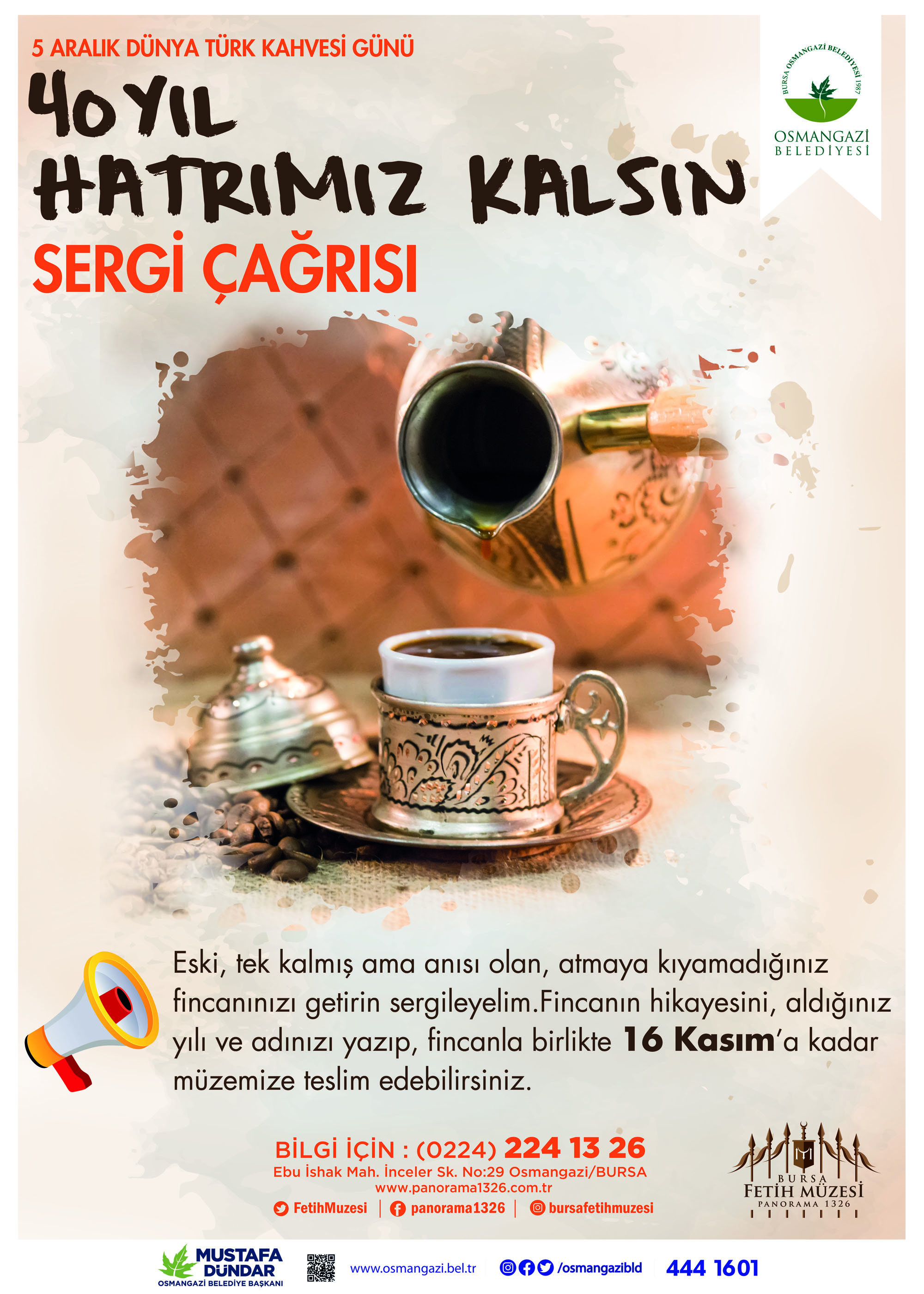 Kahve tutkunlarını buluşturacak sergiye tüm vatandaşları davet eden Osmangazi Belediye Başkanı Mustafa Dündar, “Günlük hayatın değişmez tatlarından olan Türk Kahvesi, çeşitliliğin artmasına rağmen ilgiyi hiçbir zaman kaybetmedi. Bizler, böylesine güzel bir lezzetin UNESCO tarafından kabul edilen özel gününe kayıtsız kalmak istemedik. 5 Aralık’ta gerçekleşecek sergide yer almak isteyen hemşehrilerimiz, 16 Kasım tarihine kadar birbirinden farklı anılar taşıyan fincanlarının hikayesini, aldığı yılı ve isimlerini yazarak Fetih Müzesi’nde görevlilere teslim edebilir. Gelin, hep birlikte 40 yıl hatırımız olsun” dedi.