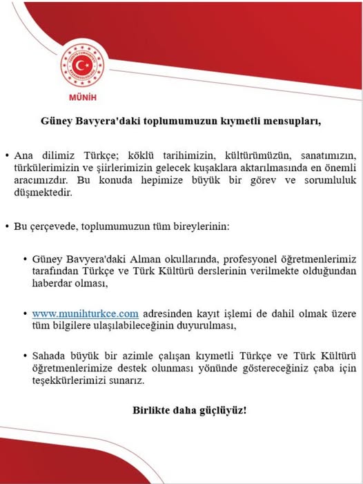 Başkonsonlosluk, Güney Bavyera’daki Alman okullarında profesyonel öğretmenler tarafından Türkçe ve Türk Kültürü derslerinin verildiğini hatırlatarak toplumun tüm bireylerini bu imkândan haberdar olmaya davet etti.