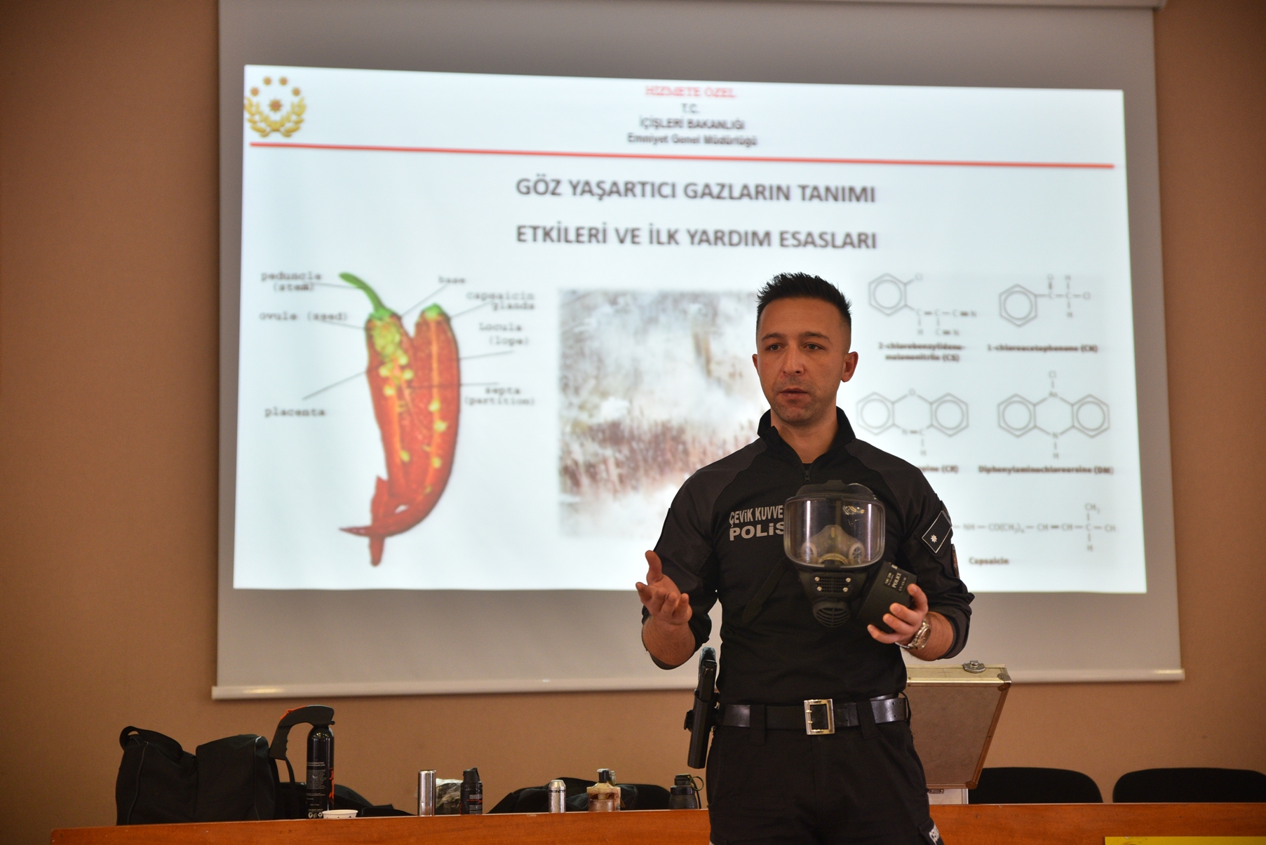 Eğitimde yaşanabilecek olaylar ya da denetim görevi sırasında meydana gelebilecek muhtemel saldırılar karşısında, biber gazının nasıl kullanılması gerektiği konusu ayrıntılı şekilde anlatıldı. Biber gazının yasal dayanakları, kullanım şekli ve hangi hallerde kullanılabileceği konularının ele alındığı eğitimin ikinci bölümünde ise açık alanda uygulama yapıldı.