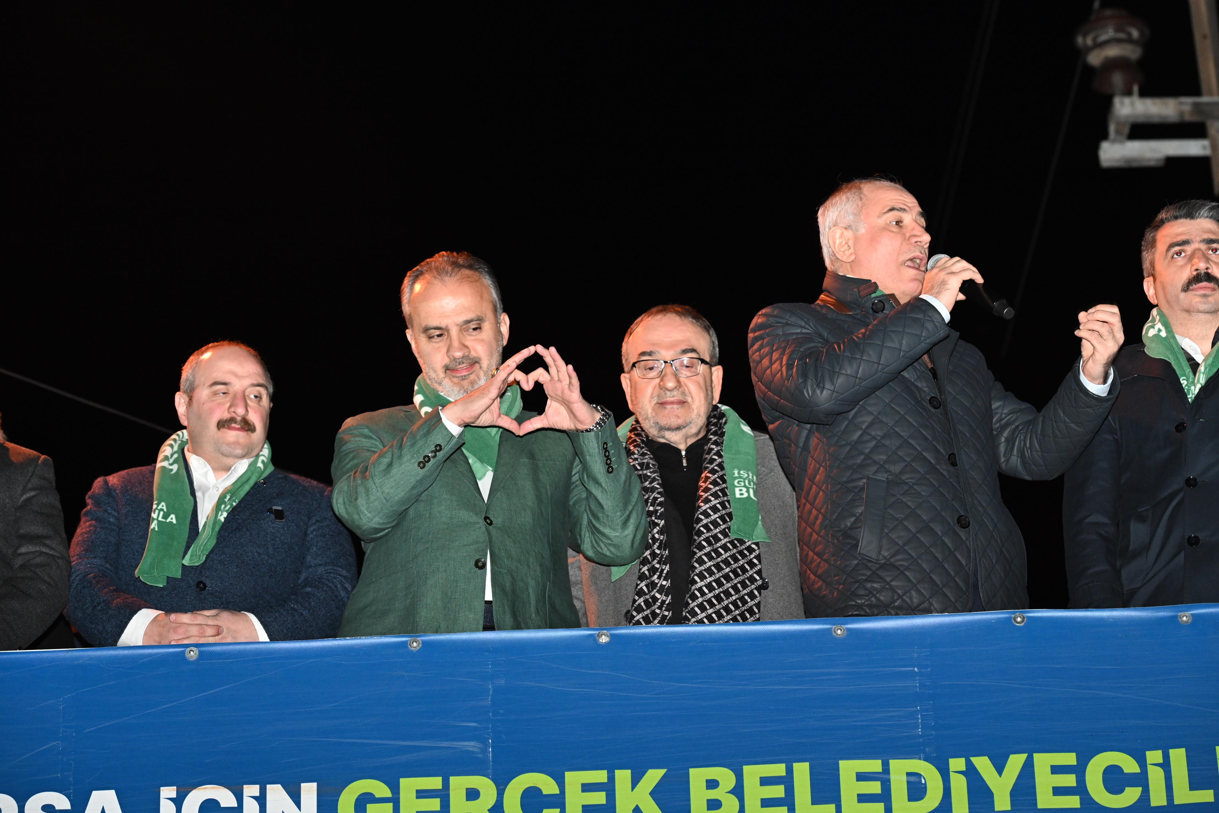 Bursa’da bu dönem altyapıdan ulaşıma, kültürden spora kadar pek çok çalışmayı hayata geçiren ve yeni döneme dair vizyon projelerini açıklayan Büyükşehir Belediye Başkanı ve Cumhur İttifakı Bursa Büyükşehir Belediye Başkan adayı Alinur Aktaş, Yıldırım ilçesi Hacivat Mahallesi’nde düzenlenen buluşmada meşale ve havai fişek gösterileriyle karşılandı. Mahalle halkının büyük ilgi gösterdiği buluşmaya, Başkan Aktaş’ın yanı sıra AK Parti Genel Başkanvekili ve Bursa Milletvekili Efkan Ala, Bursa Milletvekili Mustafa Varank, AK Parti İl Başkanı Davut Gürkan, Yıldırım Belediye Başkanı Oktay Yılmaz, meclis üyeleri ve siyasi parti temsilcileri de katıldı.