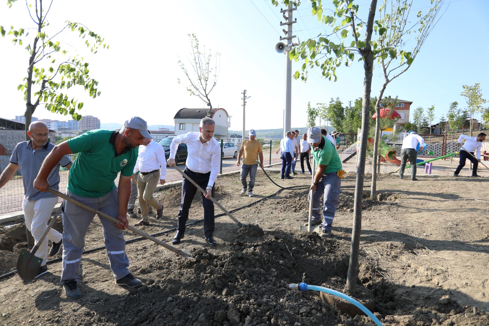 Belediye Başkanı Alper Taban, beraberindeki Başkan Yardımcısı Fevzi Dülger, AK Parti İlçe Başkanı Mustafa Durmuş, meclis üyeleri ve parti yöneticileriyle birlikte Perşembe günü hem yapımı tamamlanan çocuk oyun alanını incelemek hem de 15 Temmuz şehitleri adına fidan dikimini gerçekleştirmek adına alana geldi. Burada 112 adet fidan protokol üyeleri ve Park Bahçeler Müdürlüğü personeli tarafından dikildi.