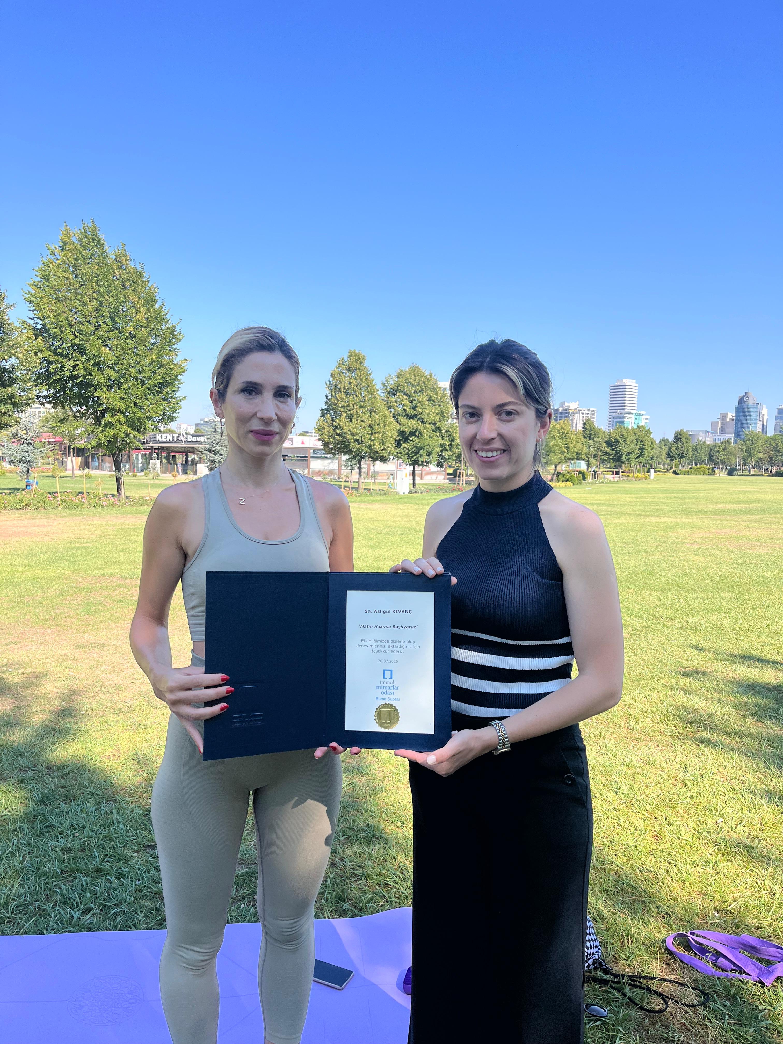 Bahar Kuş, Pilates Eğitmeni Aslıgül Kıvanç'a katkılarından dolayı bir teşekkür nişanı sunarken, bu tür etkinliklerin mimarları bir araya getirerek mesleki dayanışmayı güçlendirdiğini ve sağlıklı yaşam alışkanlıklarını desteklemede önemli bir rol oynadığını belirtti.