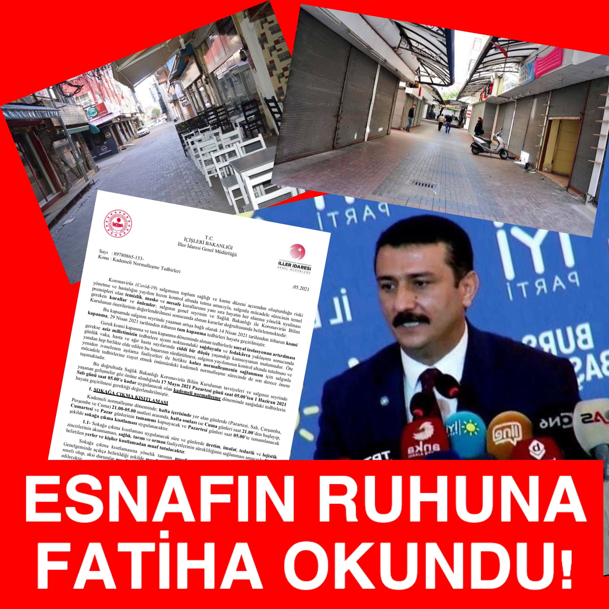 İYİ Parti Bursa İl Başkanı Selçuk Türkoğlu, ‘Yeni Normalleşme’ iddiasıyla açıklanan İçişleri Bakanlığı Genelgesi’nin, mezarı kazılan esnafın ‘sala’sı anlamına geldiğini vurguladı.