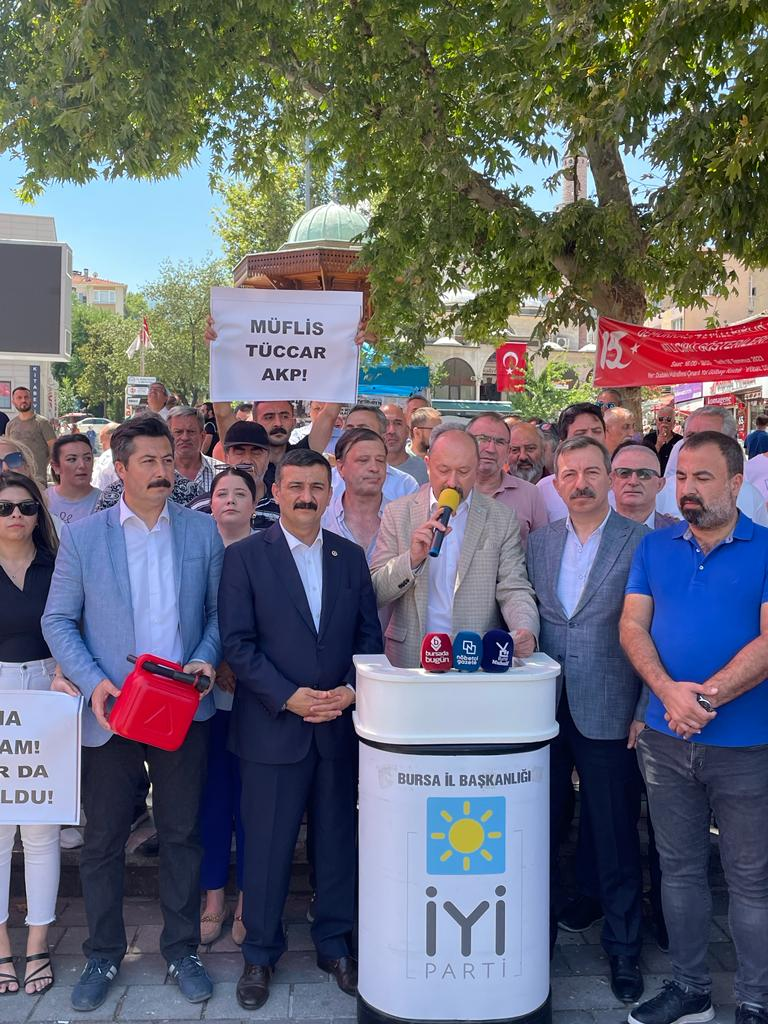 İYİ Parti’nin ülke genelinde gerçekleştirdiği eş zamanlı zam protestosuna Bursa İl Teşkilatı da Şehreküstü Meyanı’nda yaptığı benzin bidonlu eylemle katıldı. Polis, benzin bidonlarının AK Parti binasına bırakılmak istenmesine izin verilmeyince büyük arbede yaşandı. Yaşanan arbedede İYİ Parti Milletvekilleri Selçuk Türkoğlu ve Hasan Toktaş polisle arbede yaşarken, diğer taraftan parti yöneticilerinden Şaban Aksoy başından yaralandı.