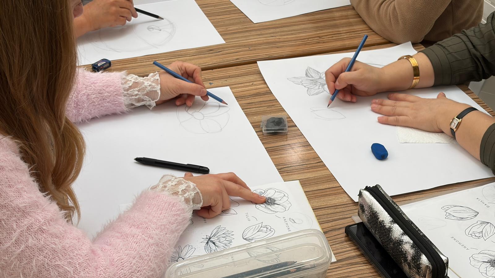 Kadınlara özel olarak planlanan eğitimlerde temel çizim teknikleri aktarılıyor. Farklı malzemelerle yapılan uygulamalar sayesinde katılımcıların estetik bakış açısı ve ifade gücü destekleniyor.